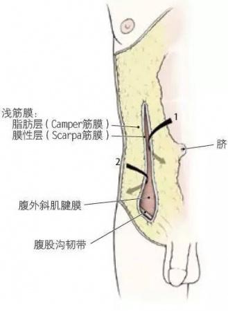 2.向下解剖浅筋膜至腹外斜肌腱膜。于切口内侧面,用手指将浅筋膜与腹外斜肌腱膜分离(图6,箭头1)。观察深面含脂肪较少的纤维结缔组织(Scarpa筋膜),并与Camper筋膜对比。