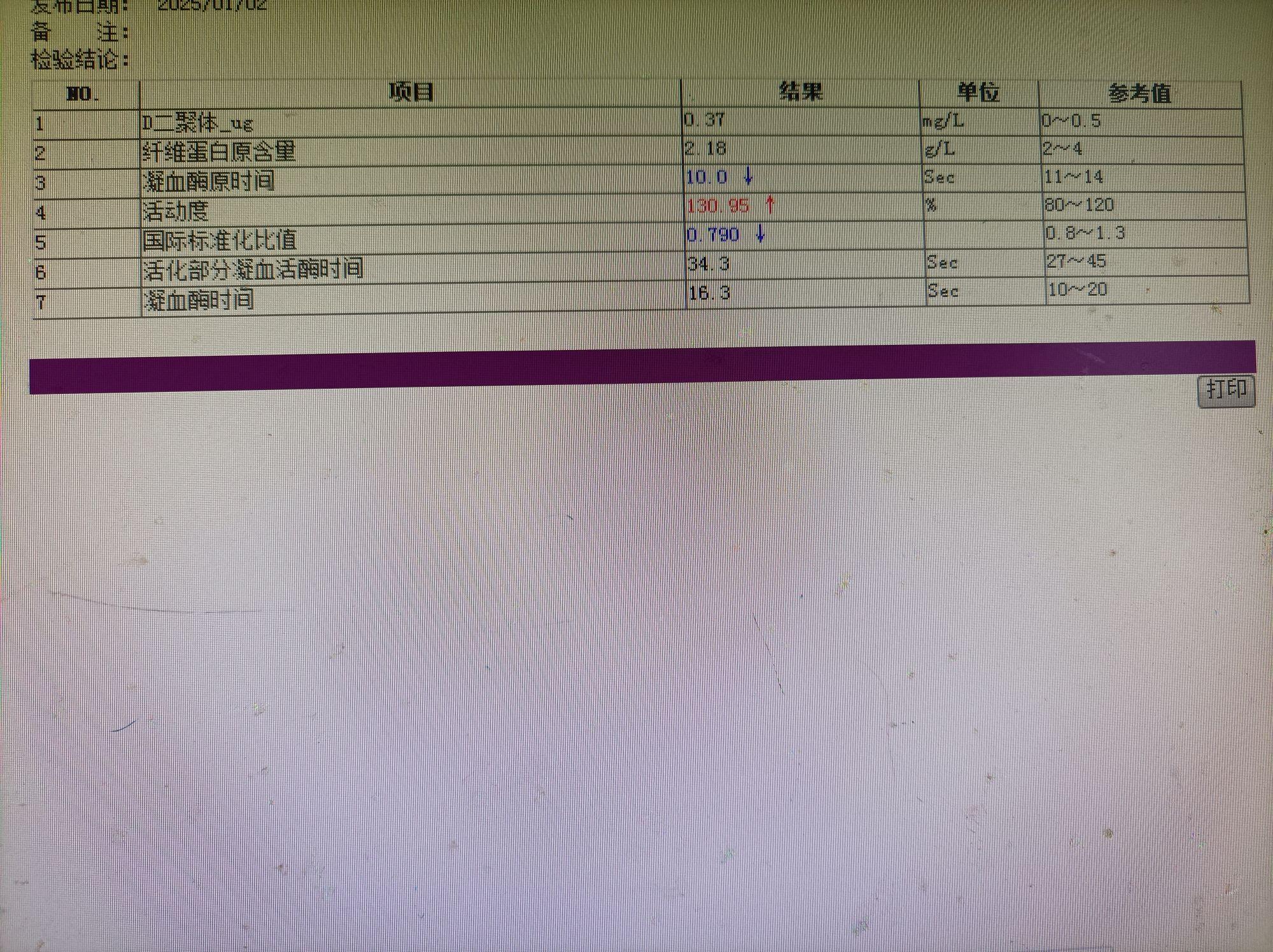 实验室检查:D-二聚体:4.5mg/L(↑,正常<0.5mg/L),血常规:WBC 8.2×10⁹/L(正常),HGB 125g/L(正常),凝血功能:PT 12.5s(正常),APTT 32s(正常)。