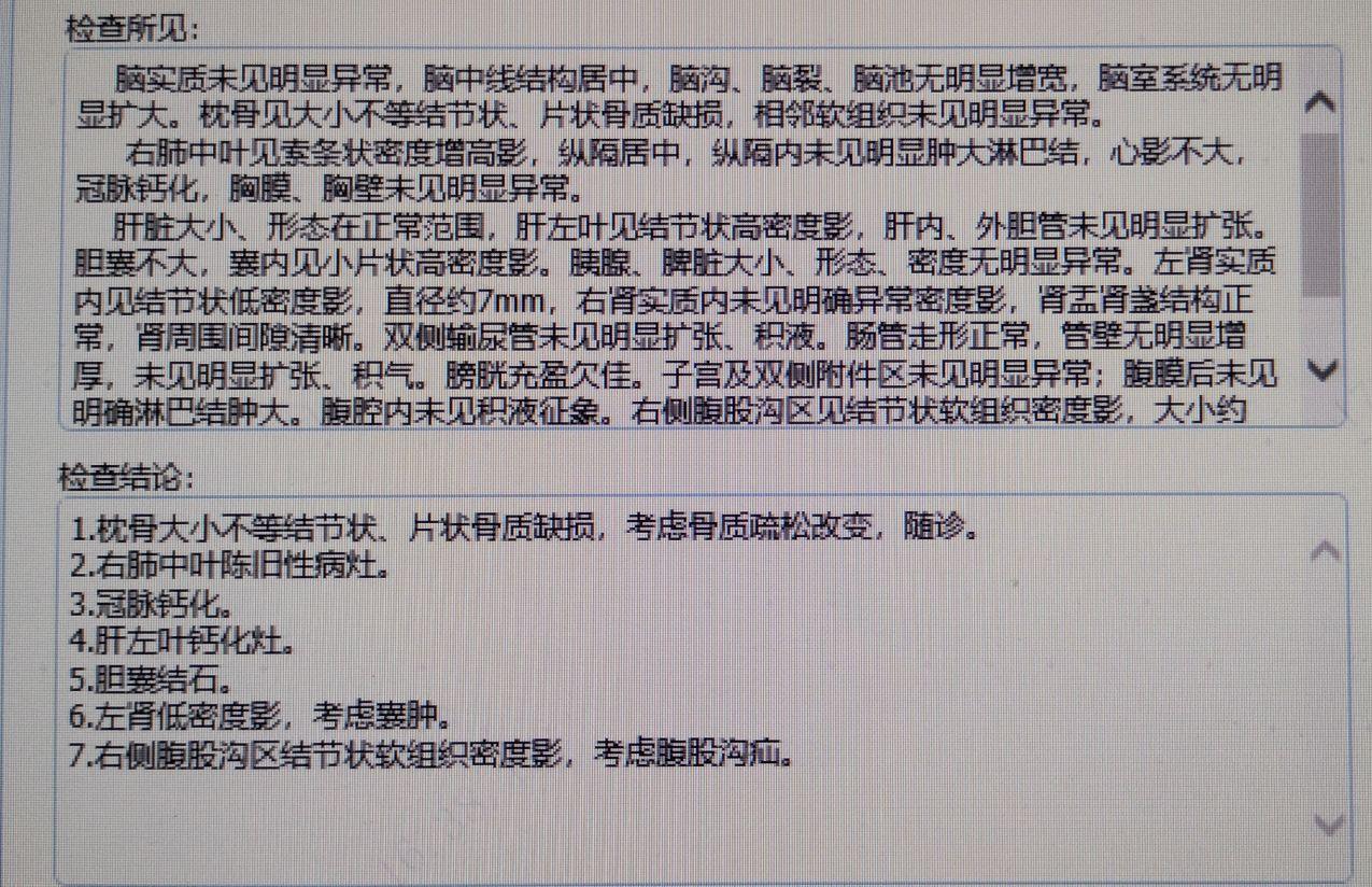 头、胸部、全腹部CT示:1.枕骨大小不等结节状、片状骨质缺损,考虑骨质疏松改变,随诊;2.右肺中叶陈旧性病灶;3.冠脉钙化;4.肝左叶钙化灶;5.胆囊结石;6.左肾低密度影,考虑囊肿;7.右侧腹股沟区结节状软组织密度影,考虑腹股沟疝。