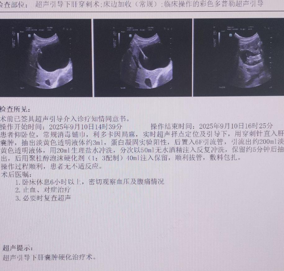 入院后予完善相关检查,排除禁忌症,入院后第2天行彩超引导下肝囊肿穿刺术:常规消毒铺巾,利多卡因局麻,实时超声定位及引导下,用穿刺针直入肝囊肿,抽出淡黄色透明液体约3ml,后置入6F引流管,引流出约200ml淡黄色透明液体,用20ml生理盐水冲洗,分次以50ml无水酒精注入反复冲洗,保留约5分钟后抽出,后用聚桂醇泡沫硬化剂(1:3配制)40ml注入保留,顺利拔管,敷料包扎。操作过程顺利,术后予氟比洛芬酯注射液止痛、苯磺酸氨氯地平片血压、奥美拉唑护胃、对症治疗,术后3天无不适,好转出院,嘱门诊随诊。
