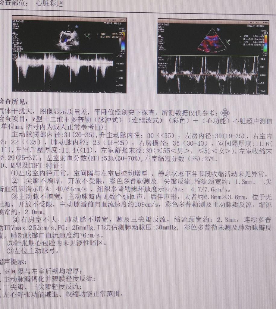 超声检查报告:1.肝囊肿;2.胆囊息肉;3.双肾囊肿,左肾结石;4.前列腺增生伴钙化;5.胰、脾、膀胱未见明显异常。凝血功能:凝血酶原时间 13.7s ,活化部分凝血活酶时间 42s,生免检验报告: 胆固醇 5.69mmol/L , 载脂蛋白A-1 1.83g/L , 淀粉酶 155U/L;血常规,肝肾功能,电解质,血糖未见异常。心电检查报告:1、窦性心律2、频发室性早搏,呈三联律3、建议动态心电图检查。 超声检查报告:1.室间隔与左室后壁均增厚;2.主动脉瓣钙化并瓣膜轻度反流;3.二尖瓣、三尖瓣轻度反流;4.左心舒张功能减退、收缩功能正常范围。