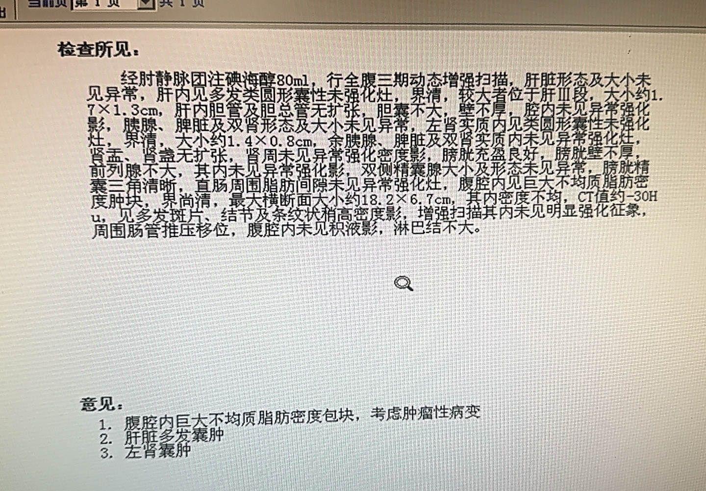 良性肿瘤(如巨大卵巢囊肿、腹腔囊肿):通常边界清晰,CT值较低(接近水密度,<20HU),增强无强化或轻微边缘强化;本例肿物密度不均匀(20-45HU)、增强有实性成分强化,且体积过大(压迫多器官),良性可能性低。 恶性肿瘤(如肉瘤、转移瘤):多表现为密度不均匀(坏死/囊变)、增强不均匀强化,常伴CA125等肿瘤标志物升高;本例影像及标志物符合,但需病理确诊。 其他(如结核性腹膜炎包裹性积液、淋巴瘤):结核性腹膜炎常有低热、盗汗,腹水多为渗出液(ADA升高);淋巴瘤常伴全身淋巴结肿大(本例浅表及腹膜后淋巴结未肿大),CT表现多为多发结节融合;本例均不支持。