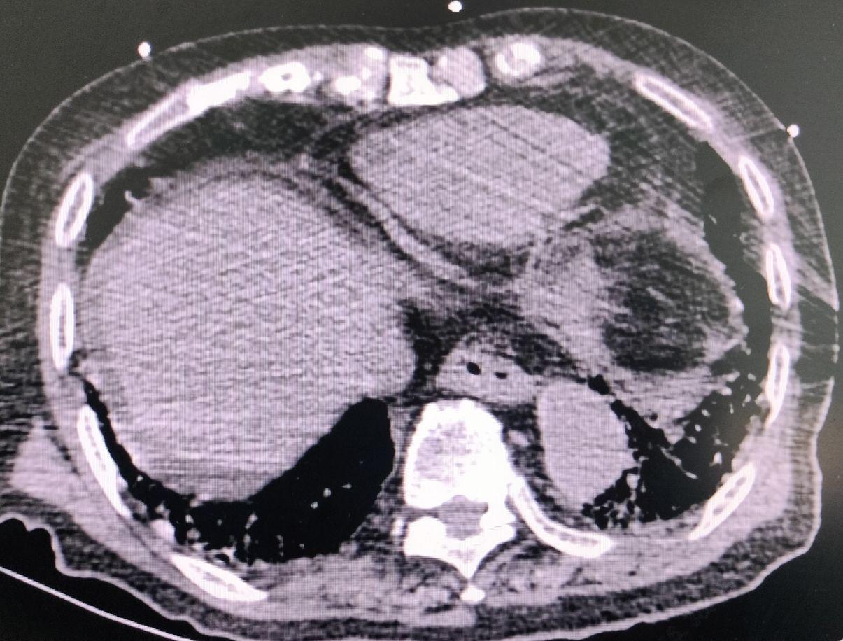 患者高龄,男性,腹部剧痛急诊入院,查体腹部呈板状腹,压痛反跳痛阳性,腹部ct提示膈下见游离气体,诊断横结肠破裂穿孔明确,消化道穿孔患者常表现为突发剧烈腹痛,迅速蔓延至全腹,伴有明显腹膜刺激征(压痛、反跳痛、肌紧张)。因穿孔继发脓毒血症,可出现高热、寒战、心动过速、呼吸急促、低血压、意识改变等感染性休克表现。
