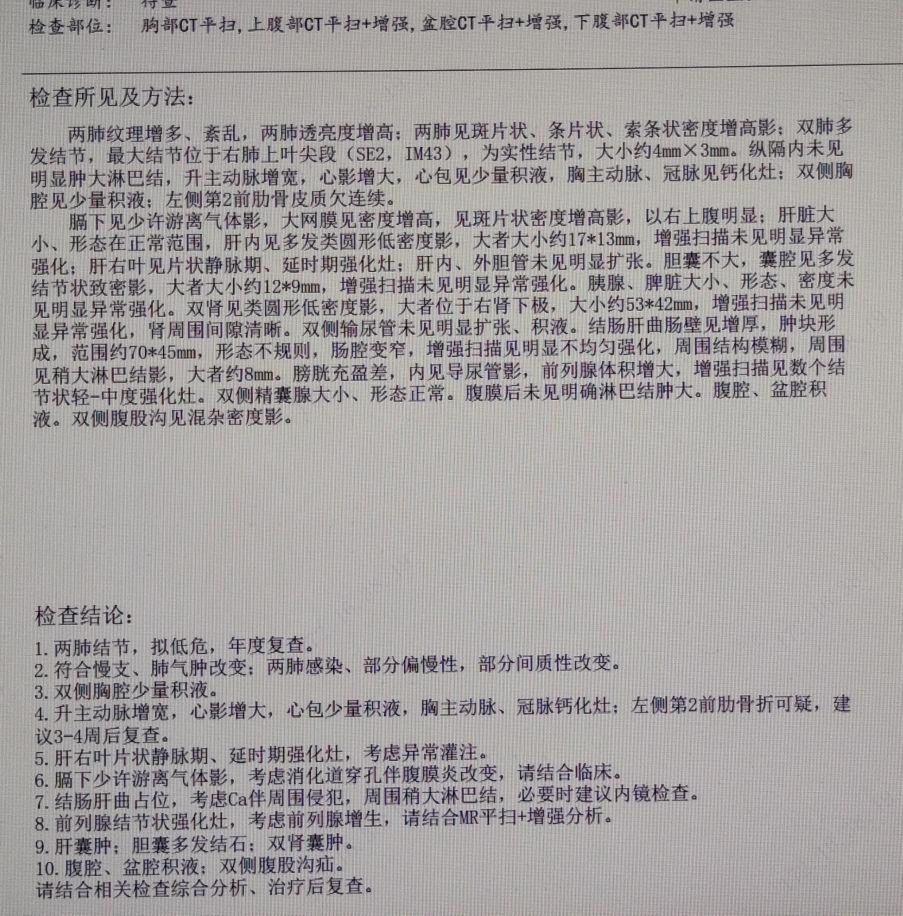 胸腹部CT平扫+增强示:1.两肺结节。2.符合慢支、肺气肿改变;两肺感染。3.双侧胸腔少量积液。4.升主动脉增宽,心影增大,心包少量积液,胸主动脉、冠脉钙化灶;左侧第2前肋骨折可疑,建议3-4周后复查。5.肝右叶片状静脉期、延时期强化灶,考虑异常灌注。6.膈下少许游离气体影,考虑消化道穿孔伴腹膜炎改变。7.结肠肝曲占位,考虑 Ca伴周围侵犯,周围稍大淋巴结。8.前列腺结节状强化灶,考虑前列腺增生。9.肝囊肿;胆囊多发结石;双肾囊肿。10.腹腔、盆腔积液;双侧腹股沟疝。