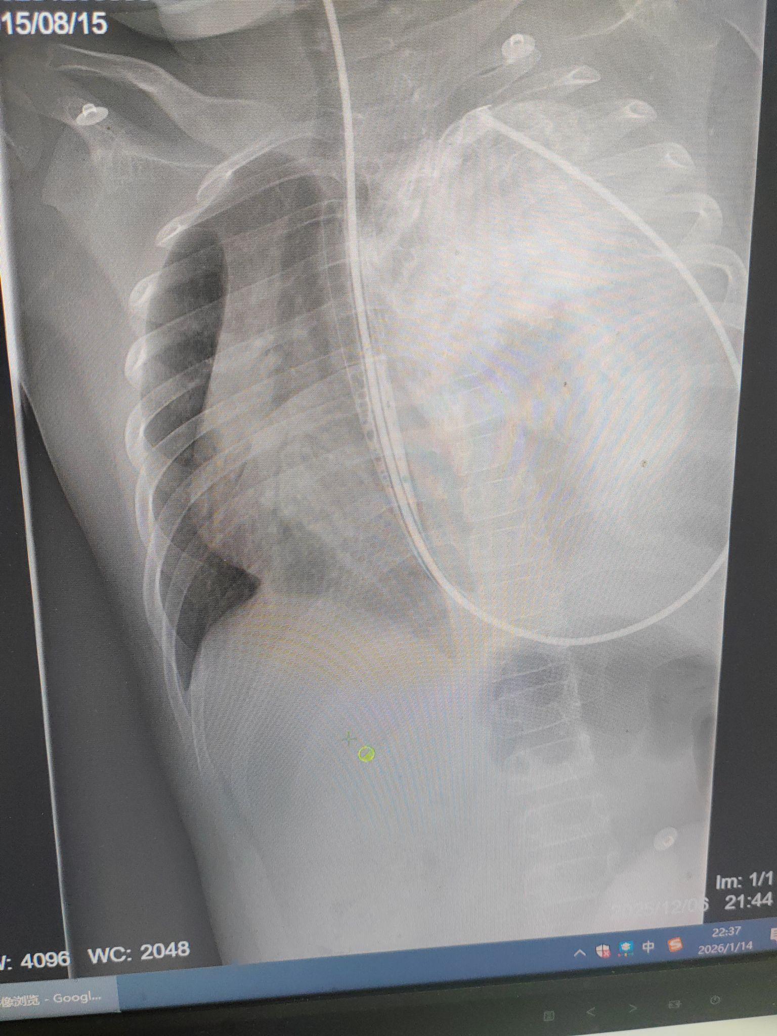 2025-12-07上消化道造影食管:走行正常,管壁柔软,光滑,粘膜规则,蠕动如常,未见狭窄。胃呈虾状位于膈上,胃容积较昨日明显缩小。十二指肠未显影。食管裂孔疝全胃疝于膈上2025-12-07CT平扫胃营养管置入术后,此次扫描示:胃内见引流管影。胸廓对称,肋骨,胸椎及其他所见骨质未见明显破坏,胸壁软组织未见异常;左肺体积明显减小,见片状高密度影及充气支气管征;右肺见条索状高密度影;纵隔稍右移,心影及大血管形态,大小未见明显异常,纵隔内未见肿块及肿大淋巴结;右侧胸腔见液体密度影。1。与2025-12-06日胸部CT对比:2。胃胃营养管置入术后;胃体及部分肠管疝于左侧胸腔,考虑膈疝3。左肺受压减轻,较前复张,双肺炎症伴少量实变4。右侧胸腔积液较前略增多。