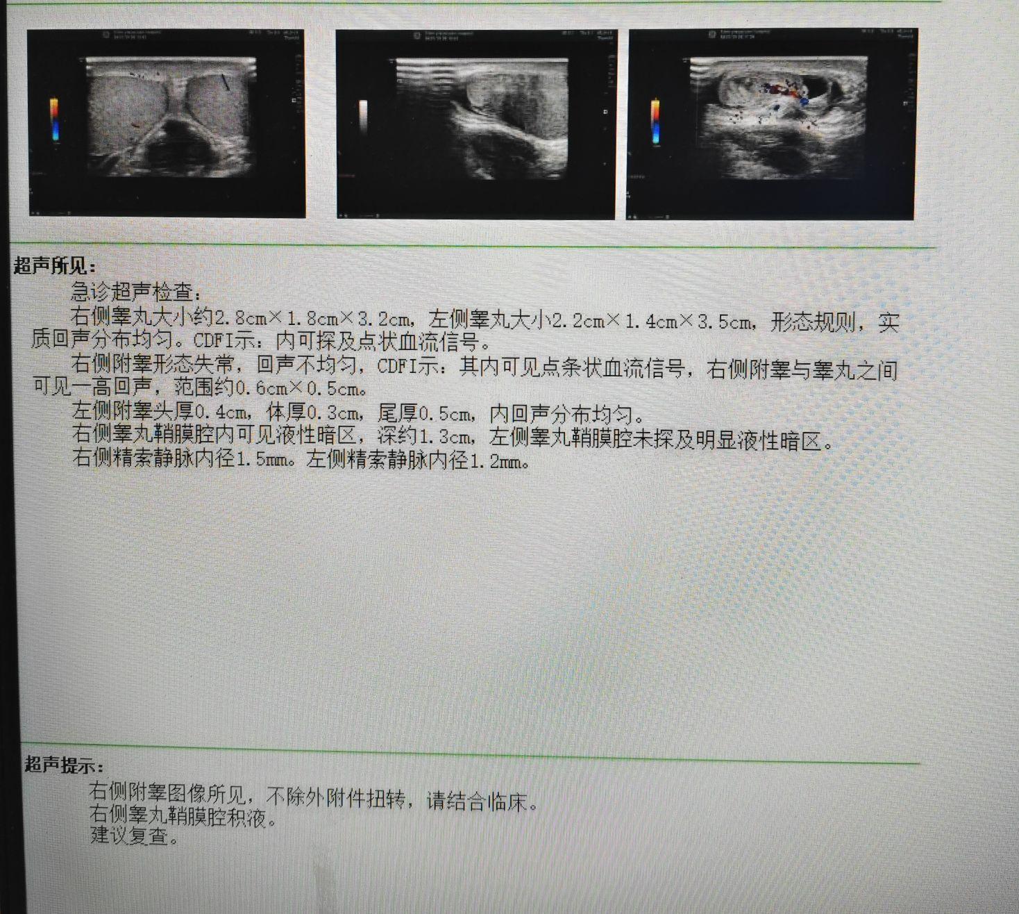 1.右睾丸附件扭转待查2.右睾丸鞘膜积液3.右侧附睾炎