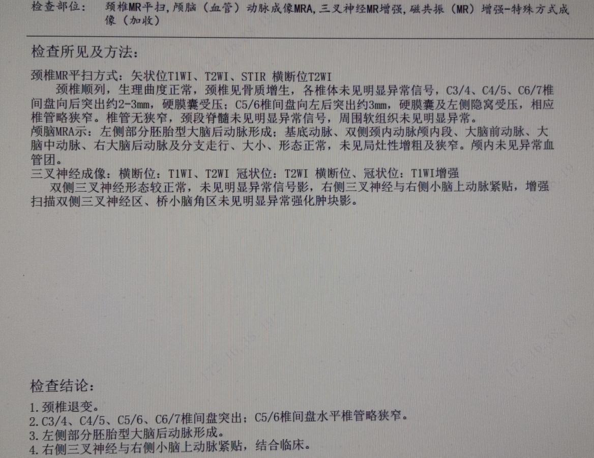 MR检查报告:检查结果1.颈椎退变。2.C3/4、C4/5、C5/6、C6/7椎间盘突出; C5/6椎间盘水平椎管略狭窄。3.左侧部分胚胎型大脑后动脉形成。4.右侧三叉神经与右侧小脑上动脉紧贴。