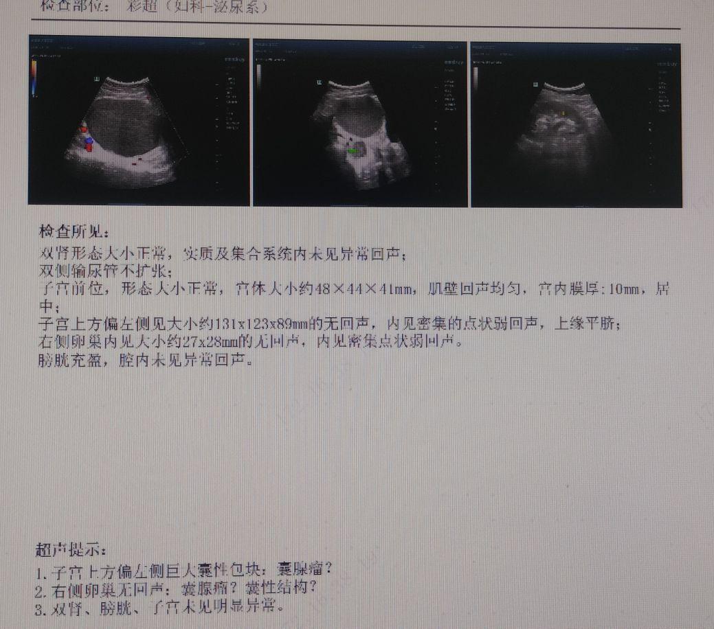 2025年01月10日妇科+泌尿系超声:双肾形态大小正常,实质及集合系统内未见异常回声;双侧输尿管不扩张;子宫前位,形态大小正常,宫体大小约48mm*44mm*41mm,肌壁回声均匀,宫内膜厚:10mm,居中;子宫上方偏左侧见大小约131x123x89mm的无回声,内见密集的点状弱回声,上缘平脐;右侧卵巢内见大小约27x28mm的无回声,内见密集点状弱回声。膀胱充盈,腔内未见异常回声。检查结果1.子宫上方偏左侧巨大囊性包块:囊腺瘤?2.右侧卵巢无回声:囊腺瘤?囊性结构?3.双肾、膀胱、子宫未见明显异常。2025-01-13 糖类抗原125 34.1U/ml。血常规、肝肾功能、电解质、血脂、血糖、凝血功能、HE4、AFP、甲功三项、CA199、CEA未见明显异常。心电图:1、窦性心动过速2、逆钟向转位。胸片:心肺膈肌未见明显异常。腹部超声:肝、胰、脾未见明显异常。病理提示(左、右侧卵巢囊肿)。