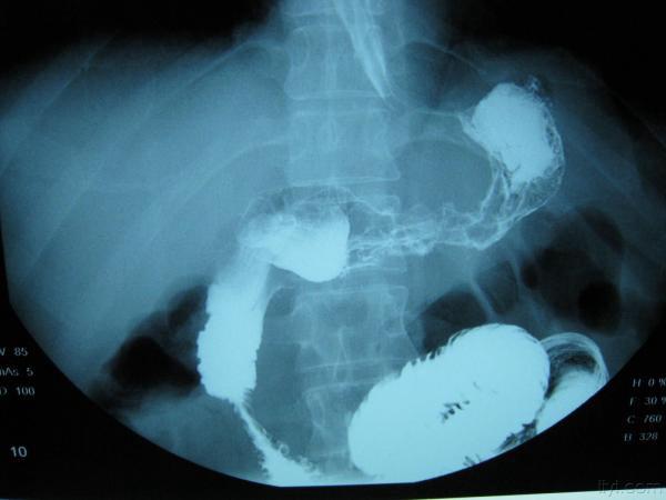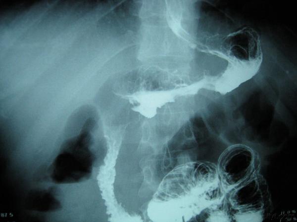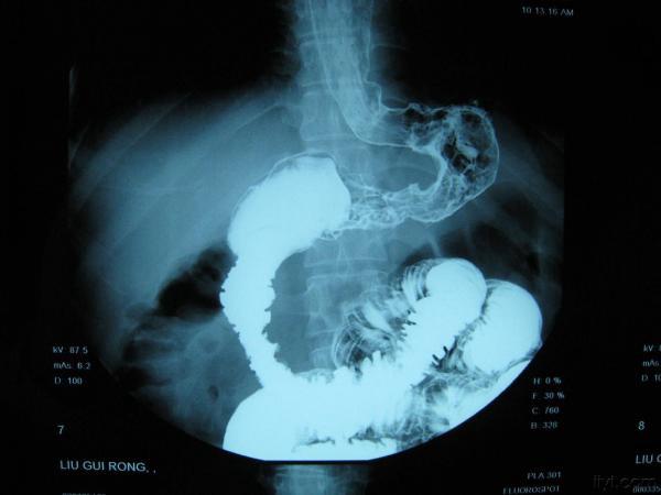 刚收一典型的皮革胃,准备明天腔镜下全胃切除,这个造影做的不错,希望对大家有帮助,只是照的不太好,见谅!!!