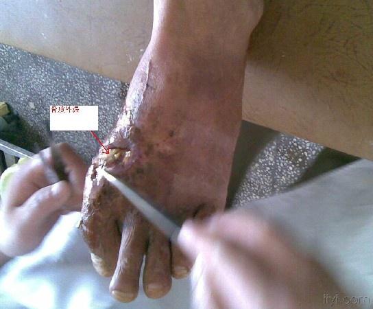 片中所示为骨质外露,部分皮肤缺损。x线未见骨痂形成。