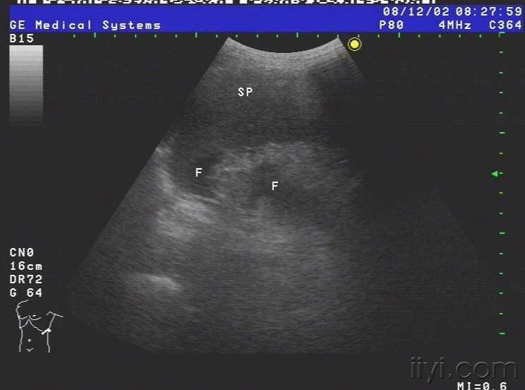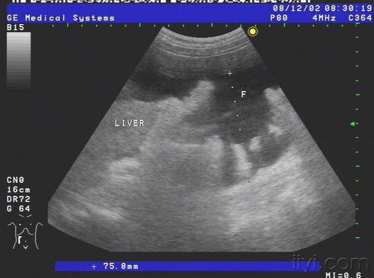 患者女,69岁,病毒性肝炎病史三年余,近半月自觉腹部胀满,来我院就诊,超声查示肝脏被膜不光滑,呈锯齿样,肝内回声不均匀,肝内多发小中等偏强回声团块,大小约1.5cm-3.0cm不等,无明显包膜,境界较清,另于肝右前叶近肝表面见一个大小约4.5cmx2.4cm的椭圆形实性低回声团块,至此处被膜略隆起,团块无明显包膜,伴侧方声影,后方回声增强,内部回声均匀,CDFI未见血流信号.右叶内另见两个类圆形囊性无回声区,肝内管道结构显示不清,肝门脉主干内径约1.1cm.胆囊壁厚1.0cm,囊内透声尚可,脾脏轻度增大,脾门脉无扩张;平卧位腹腔扫查于肝上前间隙肝肾隐窝脾肾隐窝双髂窝均见液性暗区.超声提示:1.肝硬化肝内多发实性团块合并胆囊炎脾轻大及大量腹水;考虑不除外肝癌?