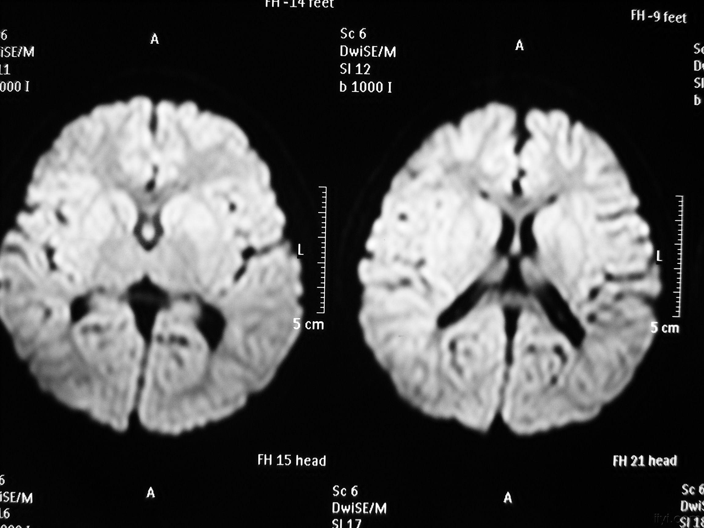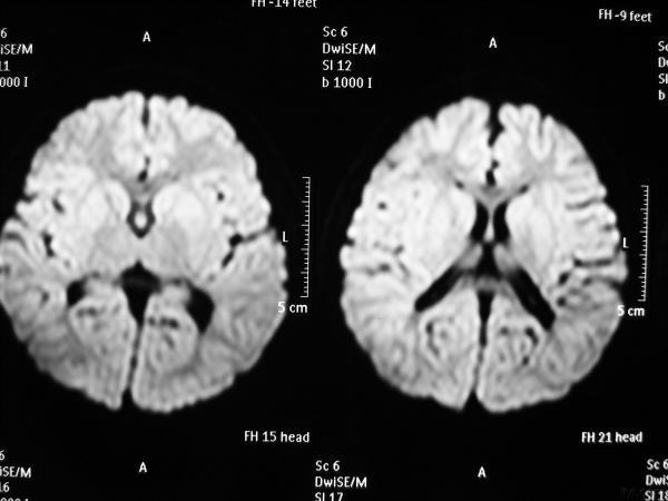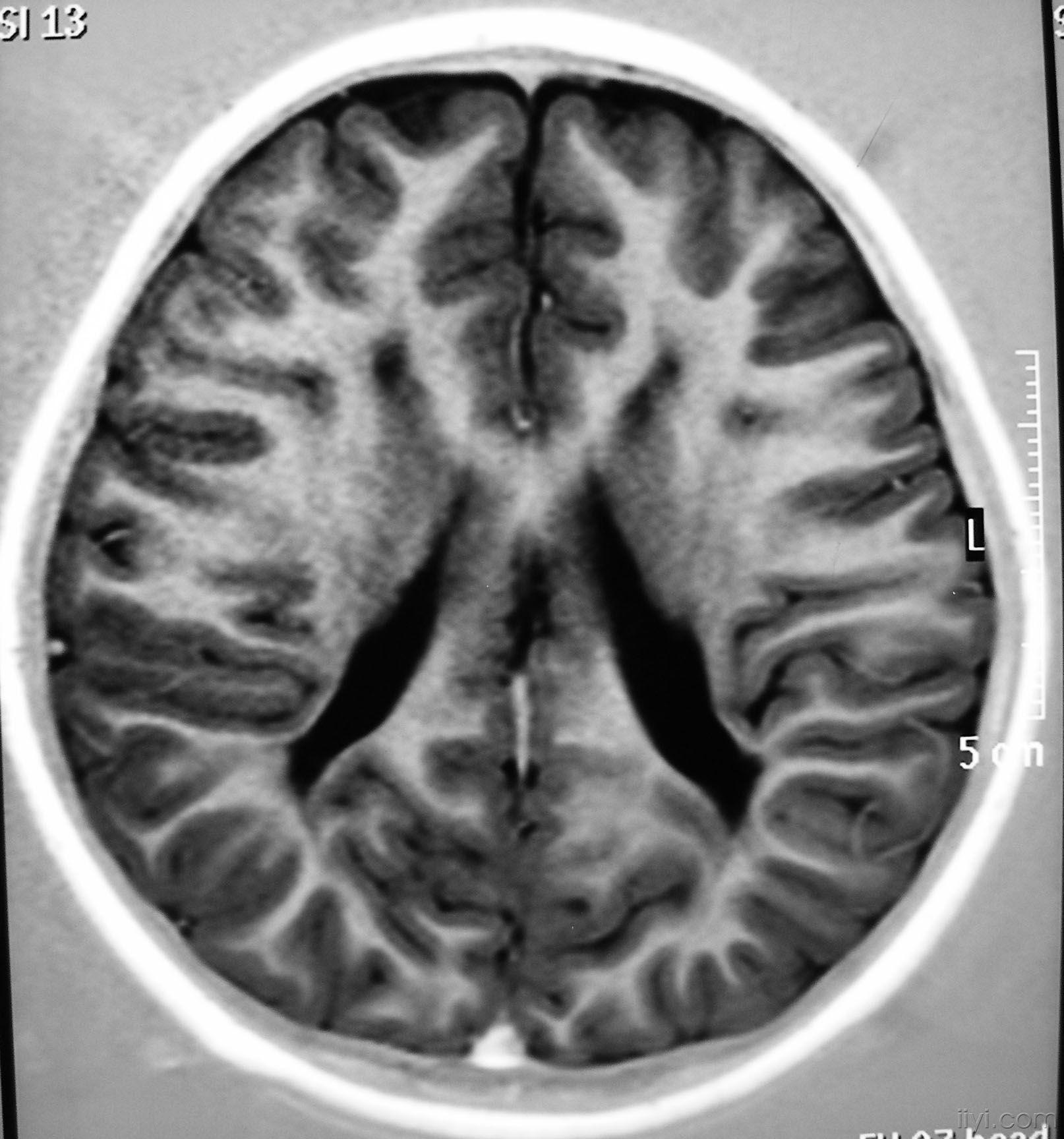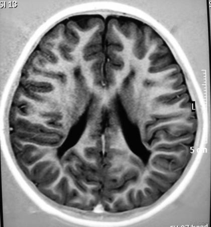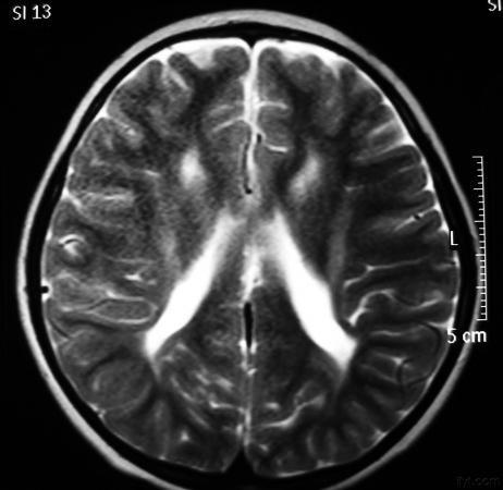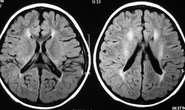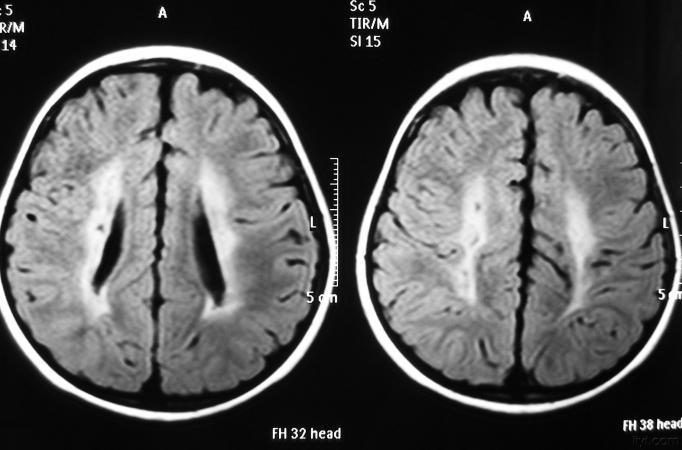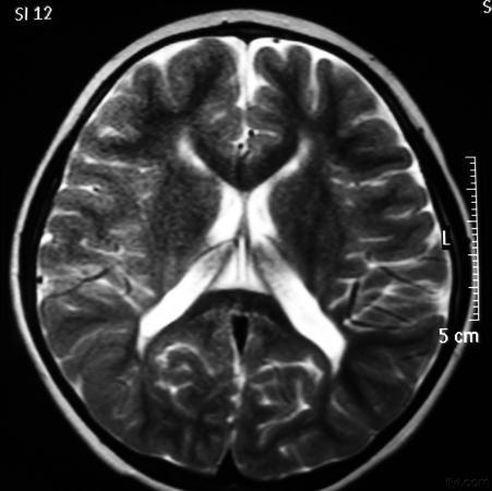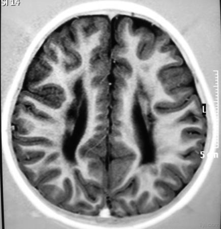 影像学发生于侧脑室周围,侧脑室扩大,脑白质减少。扩大的侧脑室外缘常不规则为其特点,多为双侧脑室同时扩大。脑白质减少,脑皮层与脑室侧缘相近。MRI T1呈低信号,T2呈高信号。