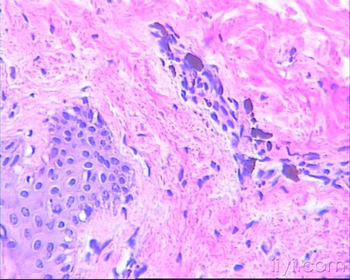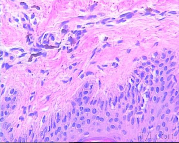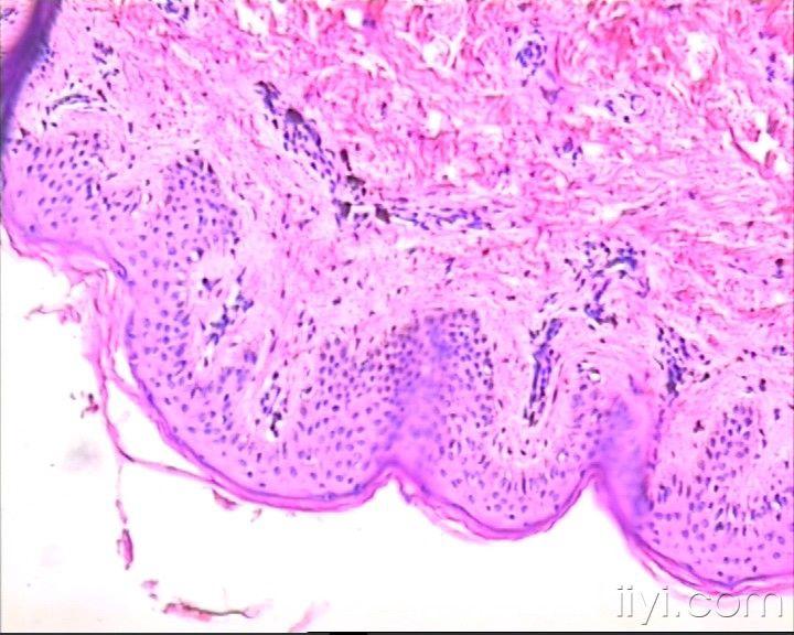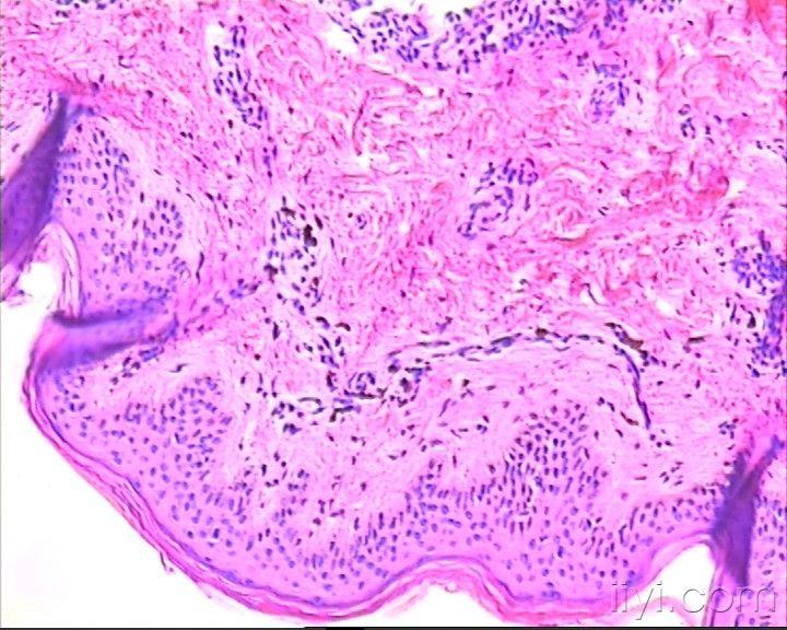 患者女,12岁,2010年1月从腹部皮肤开始出现鲜红色皮肤斑块,伴瘙痒,逐渐蔓延至全身皮肤(面部,手、足除外)。2010年3月开始,皮肤斑块转为褐色。病检取自背部皮肤。患者肝肾功及血常规均正常,无其它异常表现,目前皮损无瘙痒。