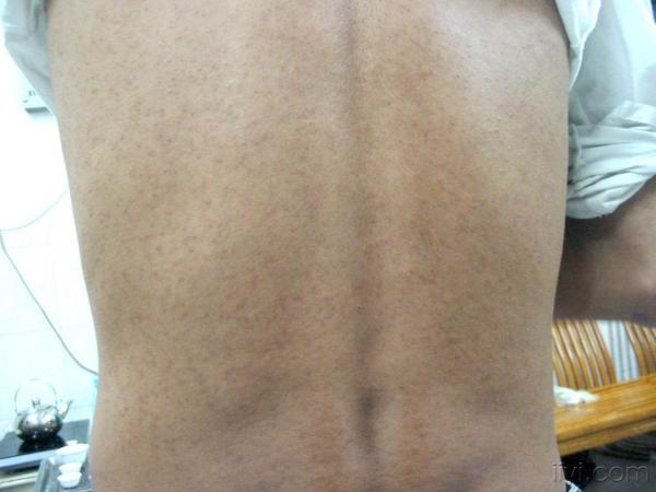 患者24岁。12岁起,上半身皮肤粗糙,不痒!余无症状。皮疹如图!