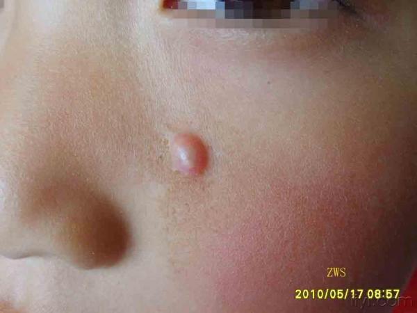 男,5岁。左面部蚕豆大圆形隆起肿物8个月。择期手术治疗(患儿放暑假做).