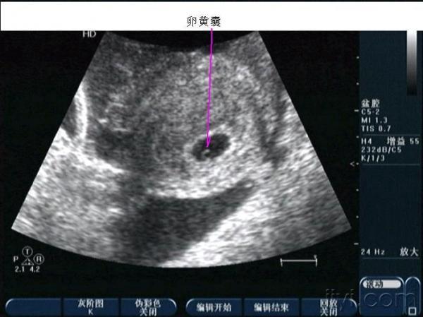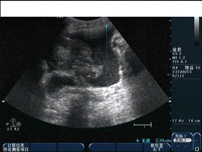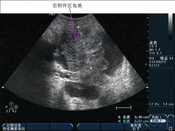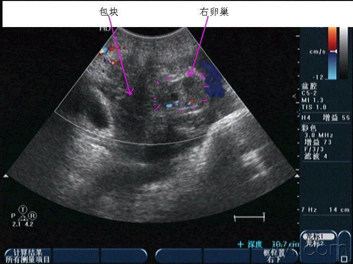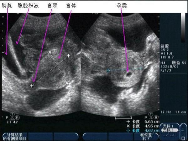 晚上房事后腹痛入院,第二天早晨8点多超声所见如下,手术证术为黄体破裂。