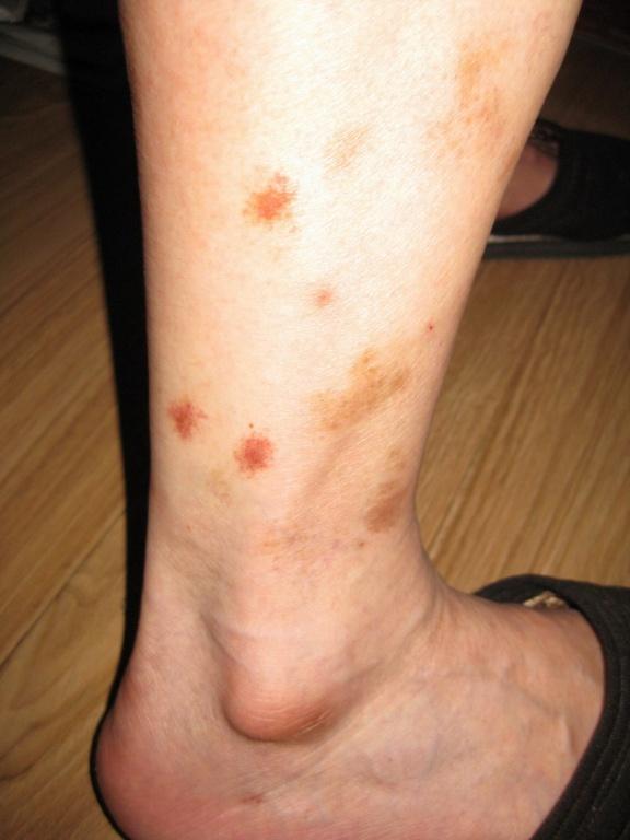 男性,70岁,这几天小腿上出现红斑,红小板计数正常,也没有其它异常感觉.前些天出的已经色素觉着了,这几天又出来了.大家看看,是什么 ,要注意些什么.