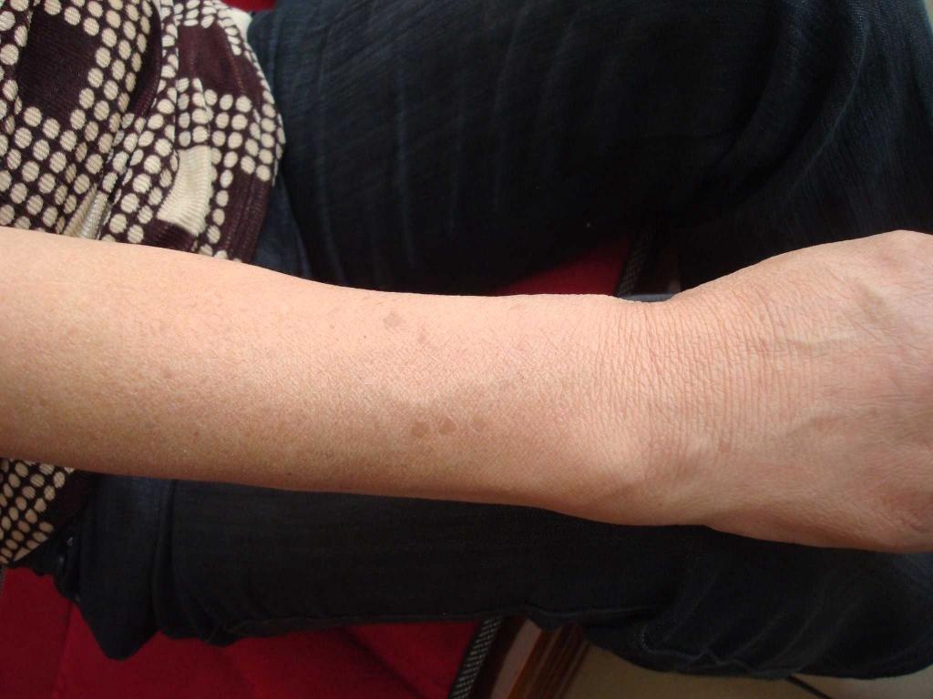 本帖最后由 争做良医 于 2010-10-27 19:29 编辑 老年女性,55岁,额上颈上两个赘生物,前臂及小腿散在褐色圆形或不规则丘疹5年.前臂丘疹经患者用手指甲挠刮后基本无明显突起.我诊断为丝状疣和扁平疣.