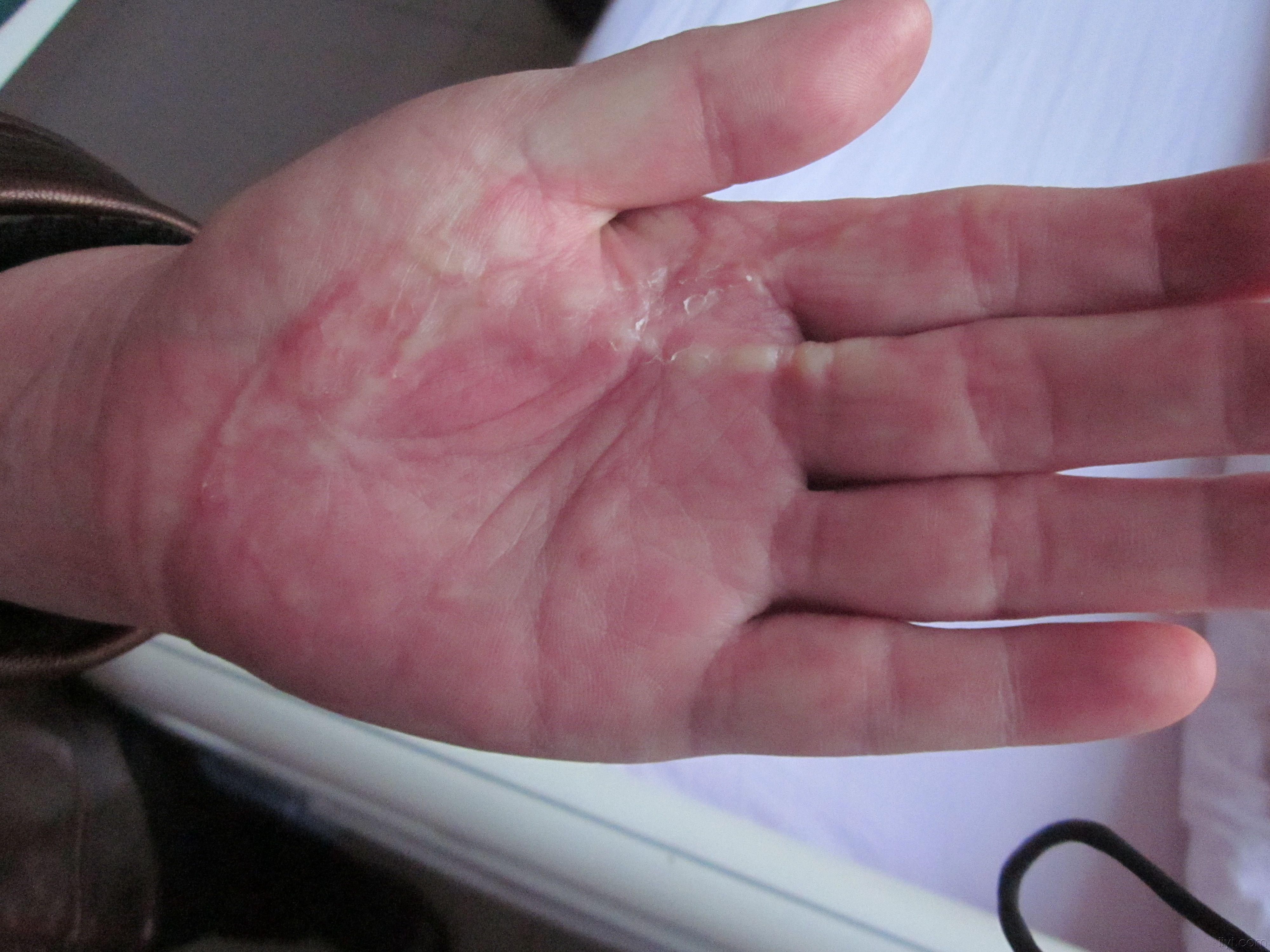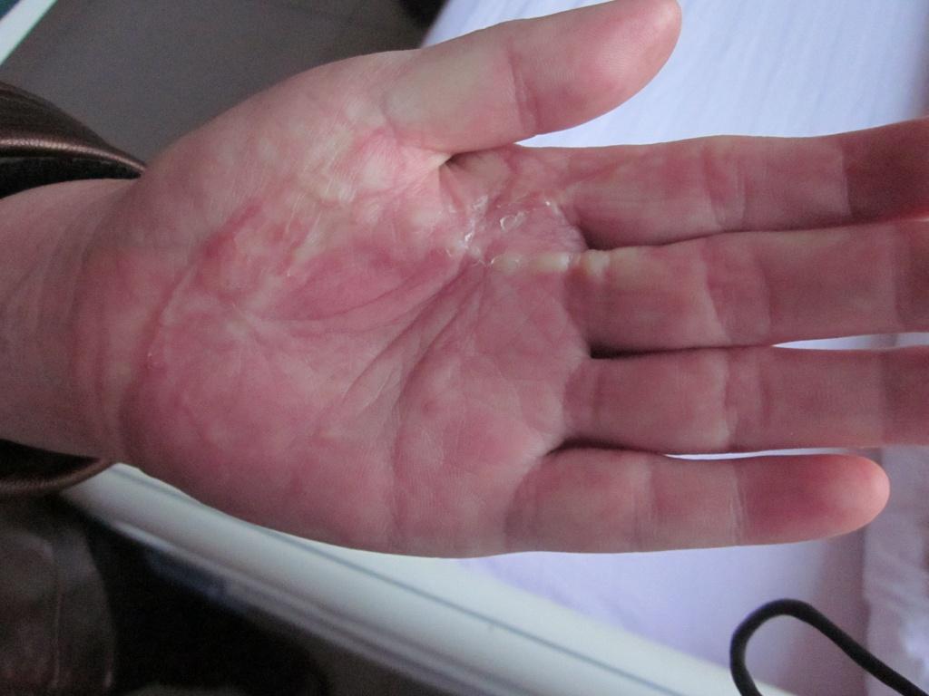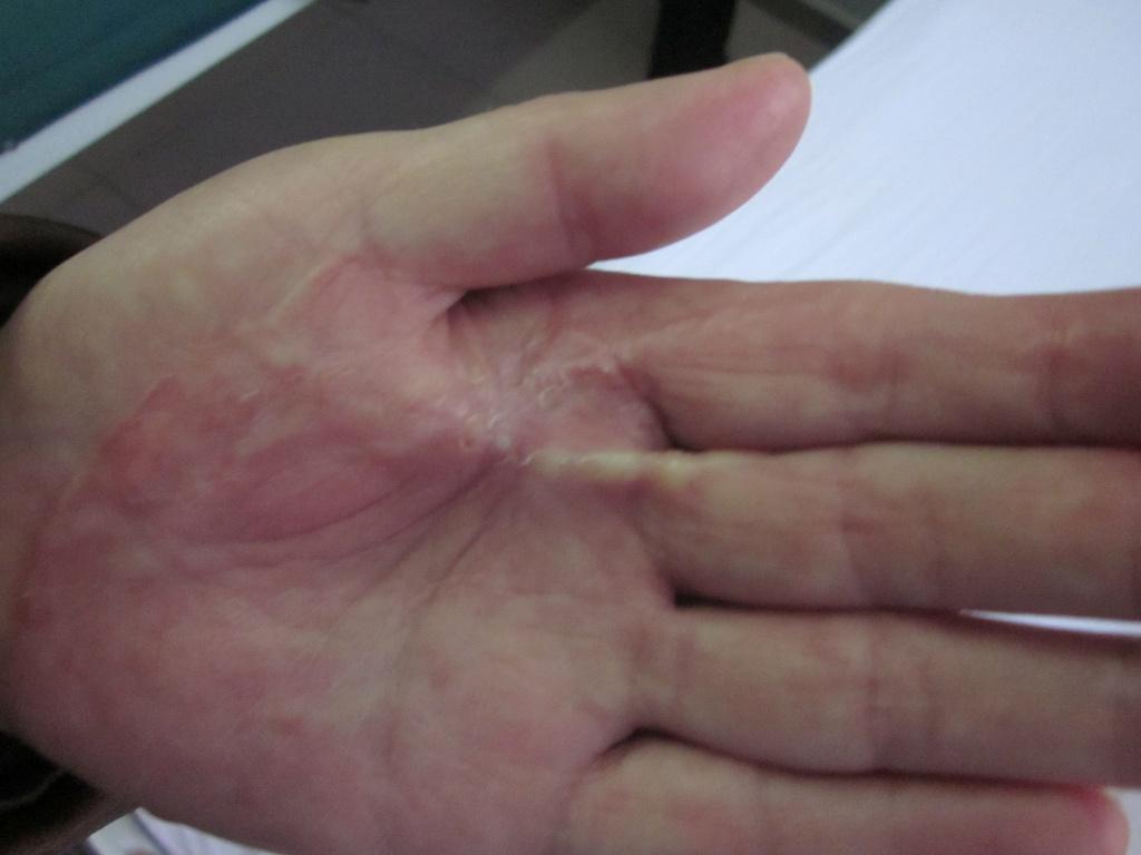从第二张照片,好像有个小洞,有没有感染啊?感觉好像皮下有东西一样的。瘢痕松解主要是松解后的皮肤缺损情况,还有术后的石膏托及功能锻炼很关键。如果植皮的一般要求全层皮片打包植皮。可以通过Z字改道解决。还有皮下屈肌腱的松解吧