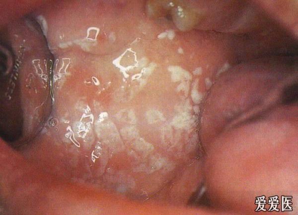 1、 发生率4%。2、部位:可发生口腔任何部位粘膜,好发于唇、颊、舌、腭(软、硬)3、 病损特点:充血发红粘膜上的白色假膜。成份:纤维蛋白、脱落上皮细胞和炎症细胞,内含菌丛。(1) 满口皆生白斑雪片,甚至咽间叠叠肿起。(2) 早期粘膜充血明显,红、白对比明显,晚期充血减轻,对比下降.(3) 斑片不易擦掉,用力剥离露出出血创面.(4) 假膜涂片可查见大量念珠菌丝.4、 全身反应不明显,可有体温升高,婴儿常有拒食、啼哭。