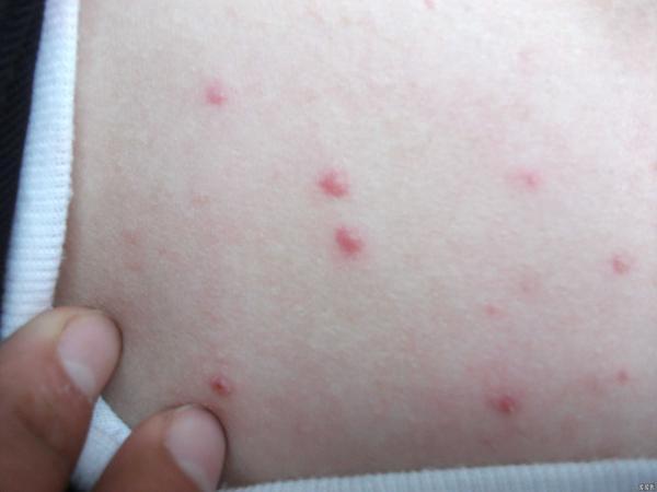 此图片为患者前胸上部。挠破后先出血,后出水,并无流浓或者奶酪样分泌物