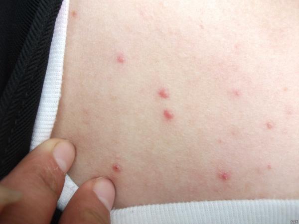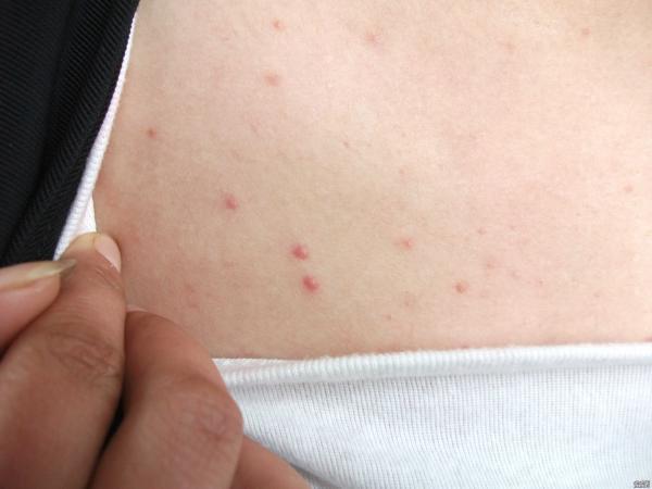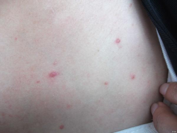 患者女,26岁,两年前前胸部出现丘疹,后扩散到前胸和后背,其他地方无。痒感明显。未经治疗,时好时坏