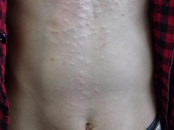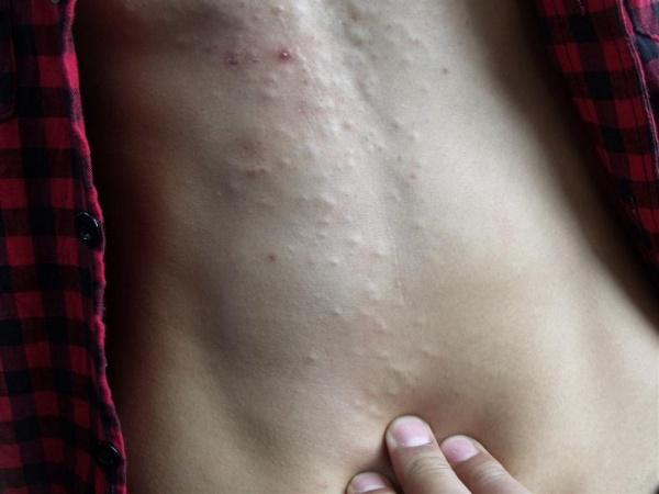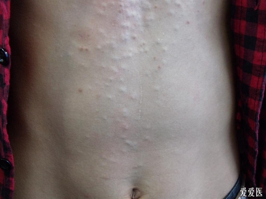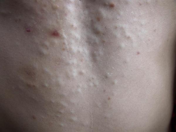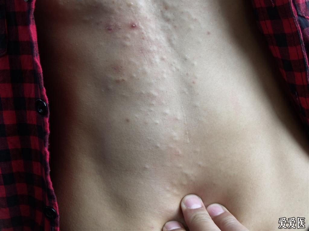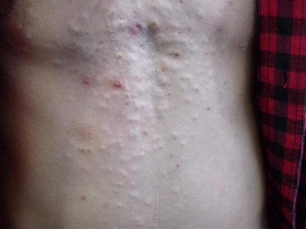 男21岁 皮肤病变一年 只有胸部 其他地方没有 ,皮下遍及黄豆大小的囊肿 可以挤出粉脓性物质 不搔痒