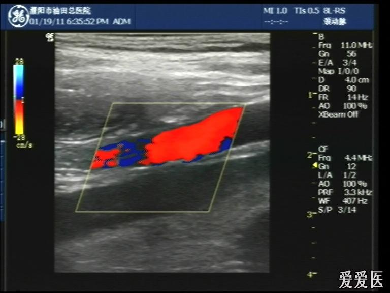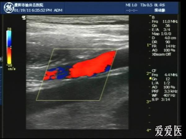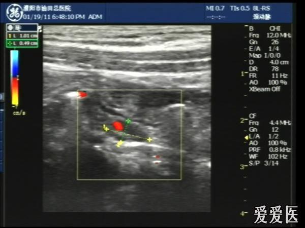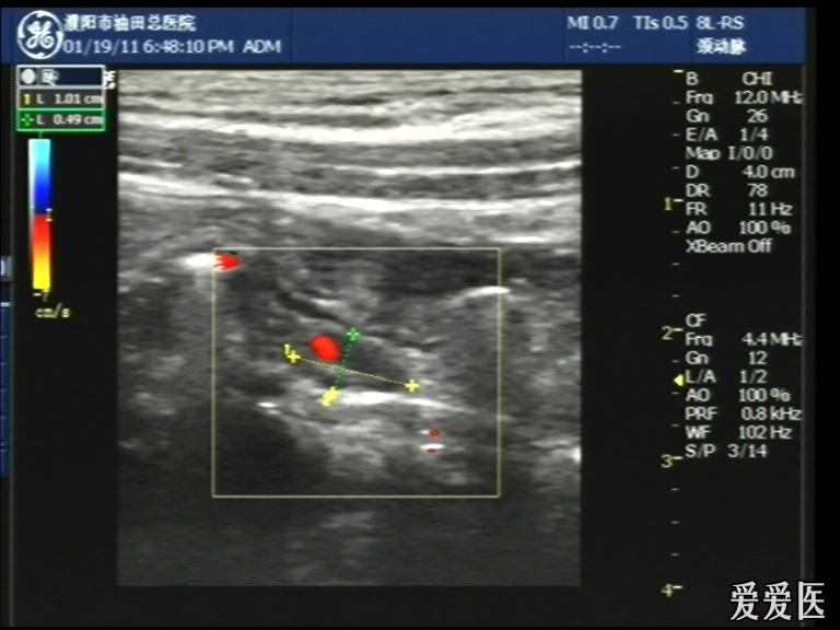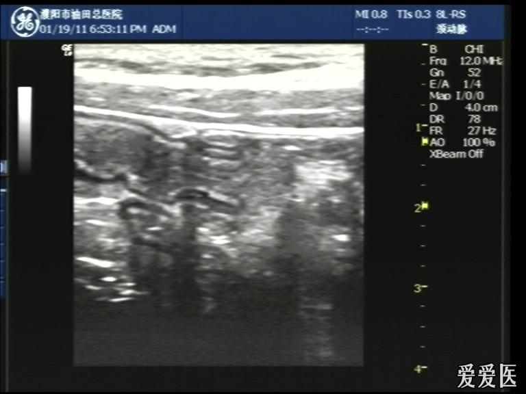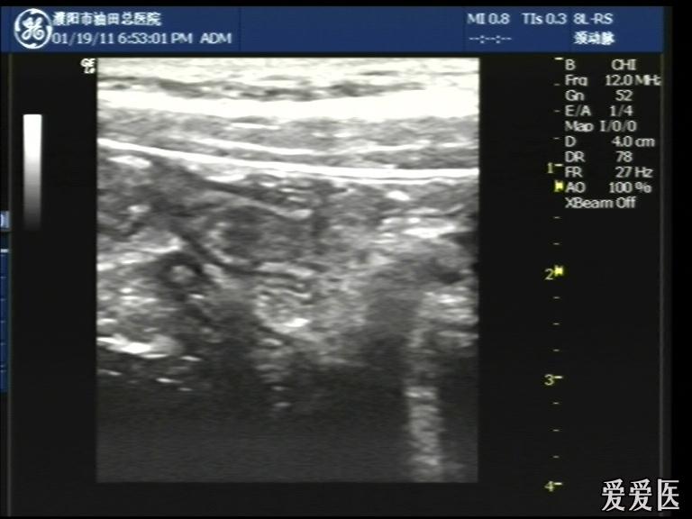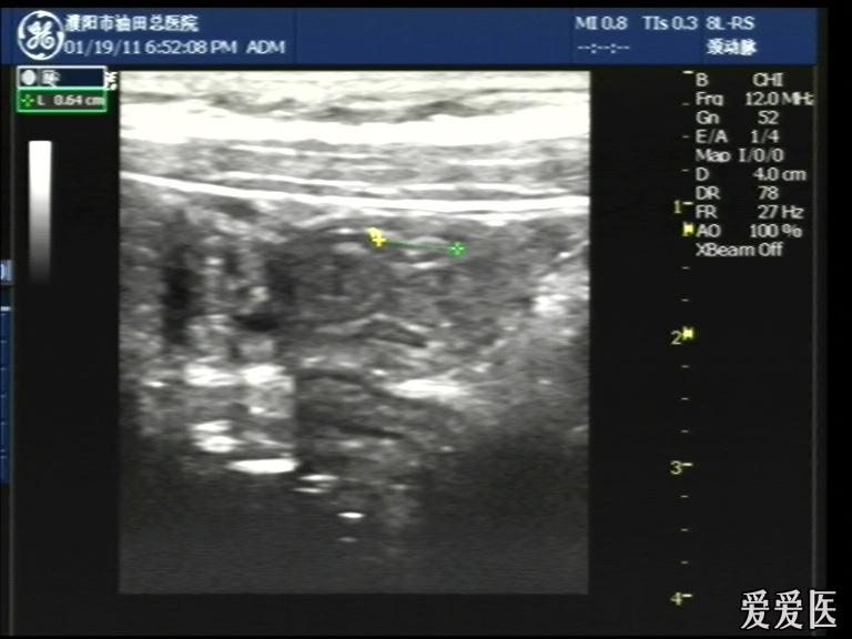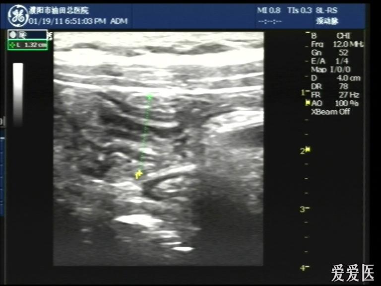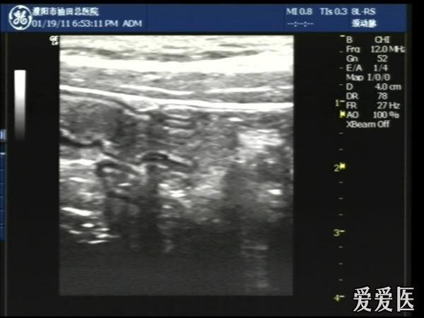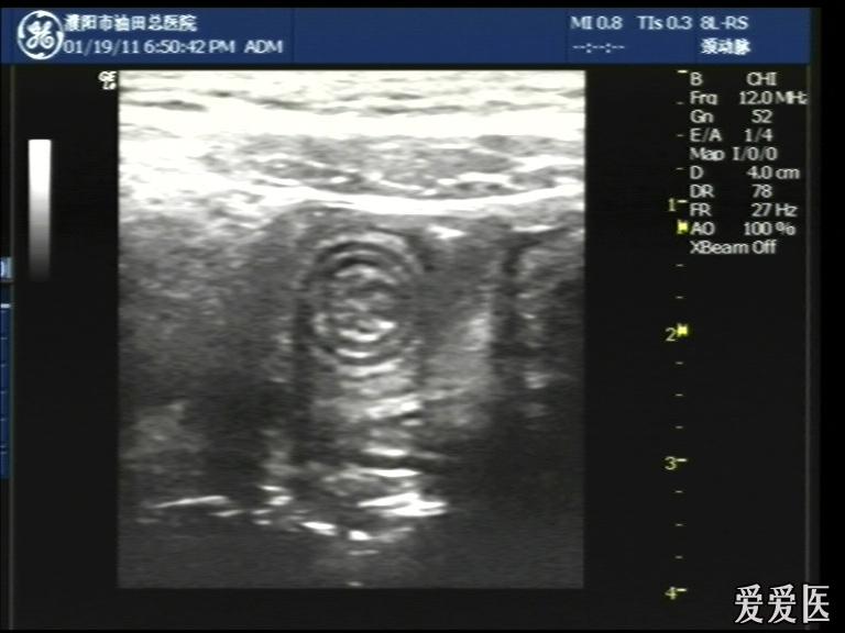 超声检查:于下腹部可见“双环征象”,双环重叠长约6mm,检查期间观察可见肠蠕动;CDFI:未见明显异常血流信号。