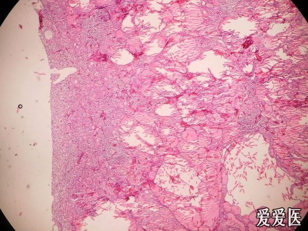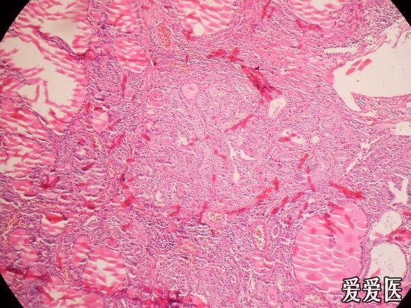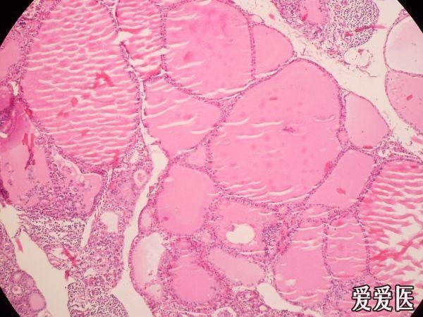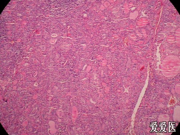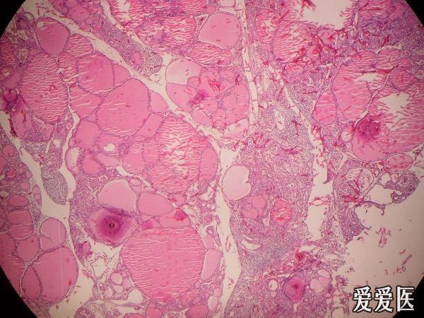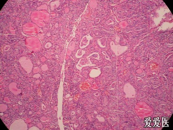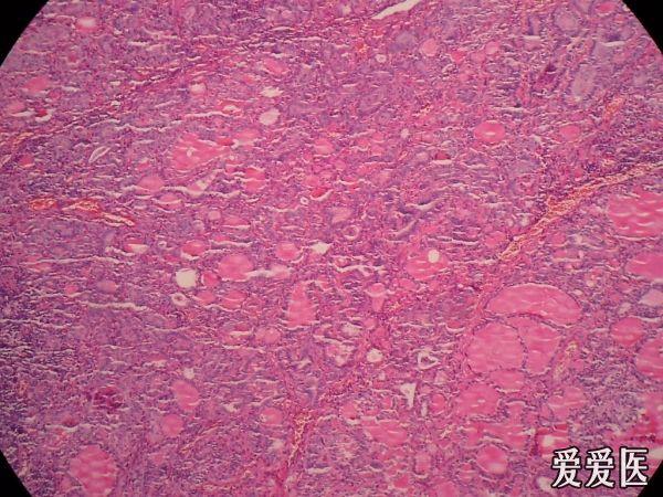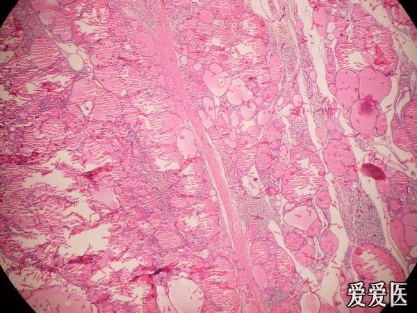 病理检查:甲状腺组织两块,大者7*5*3厘米,切面灰红质软,小者:6*4*3厘米,性质同上。