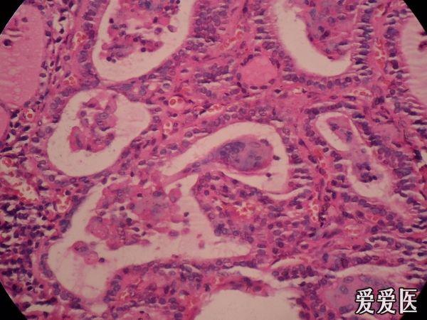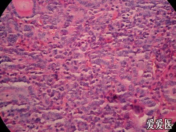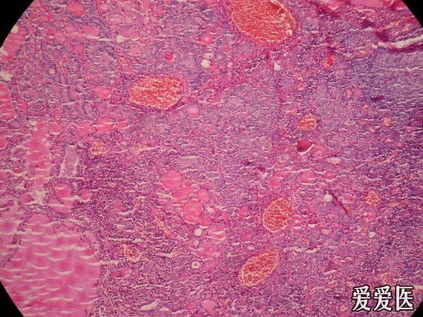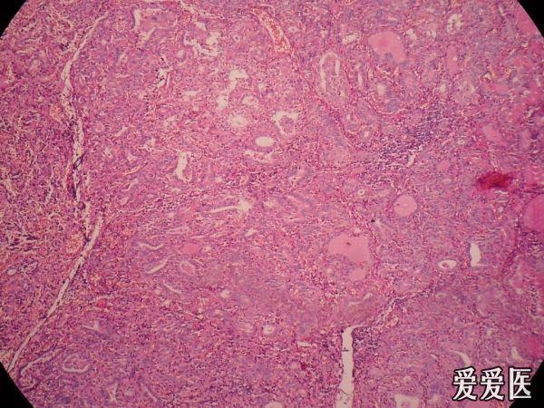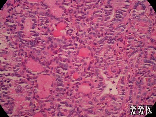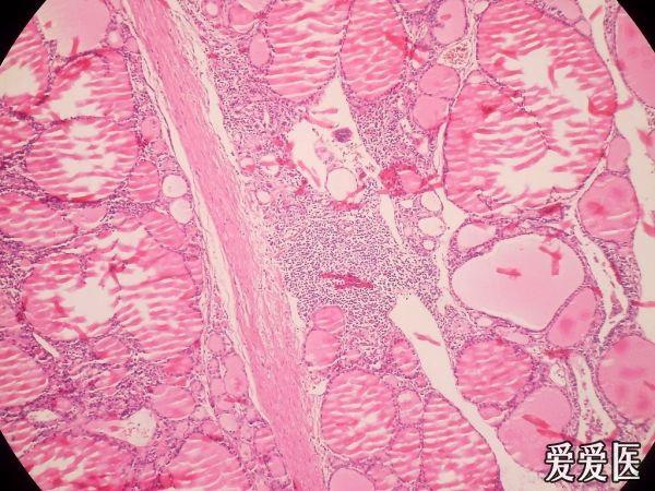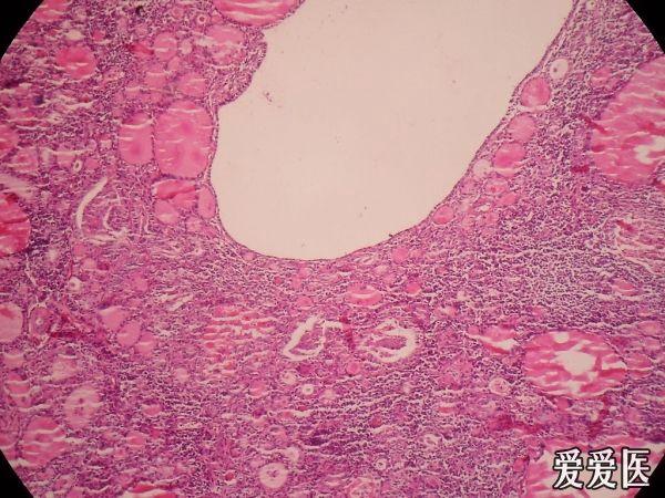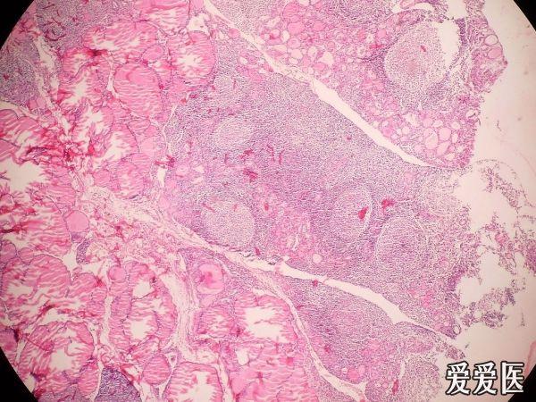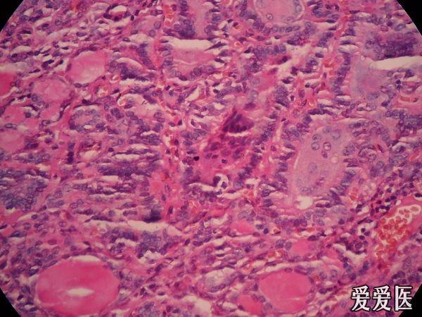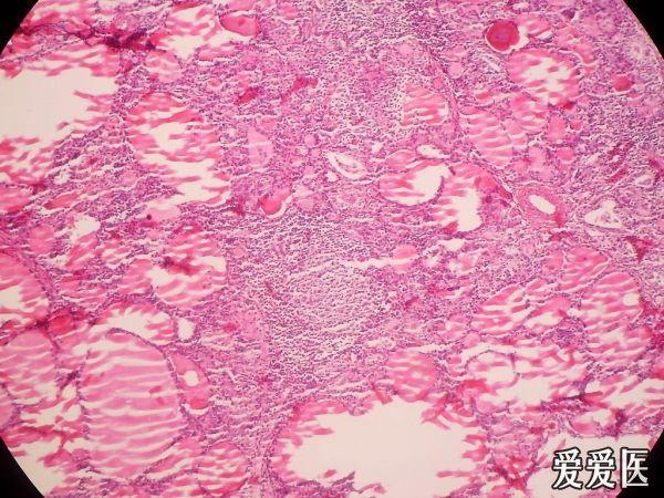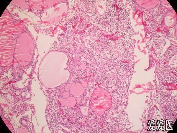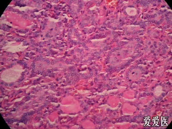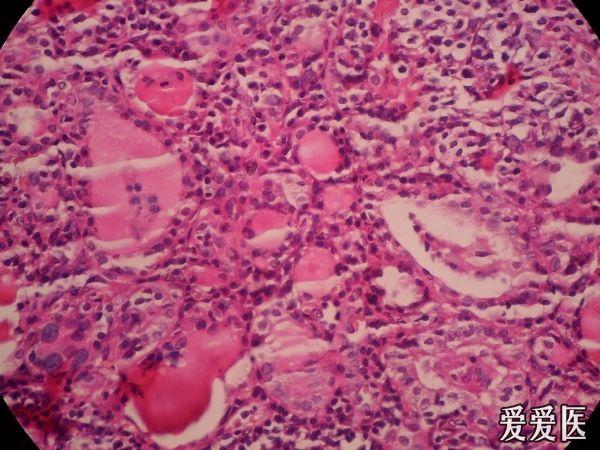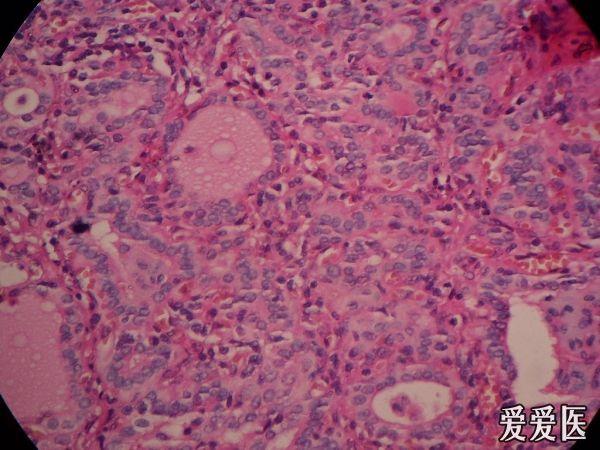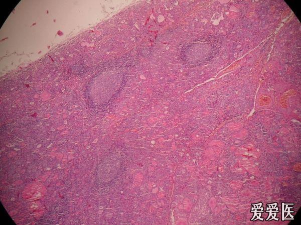 镜下: 淋巴滤泡:大小不规则的甲状腺滤泡:有的细胞核似有异型性?