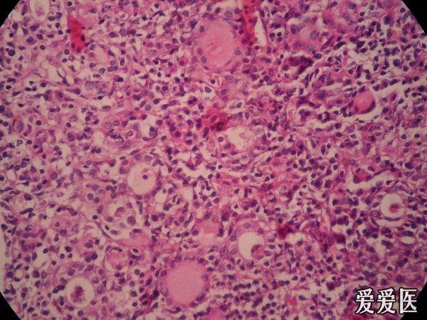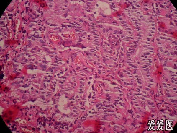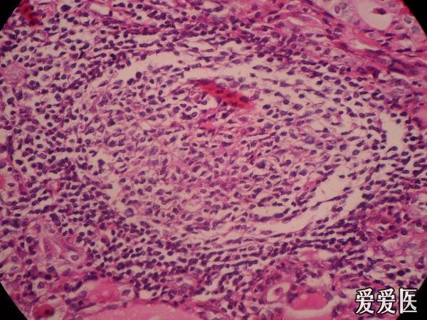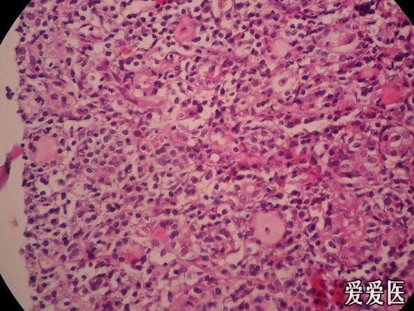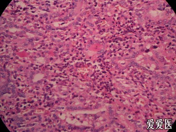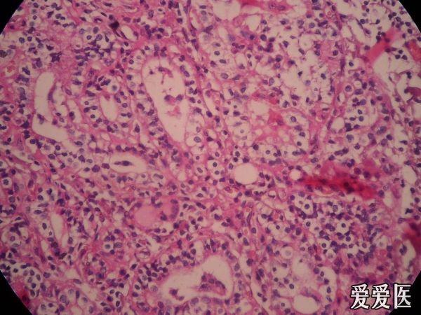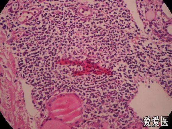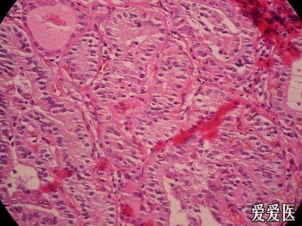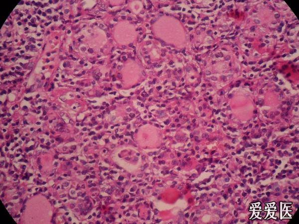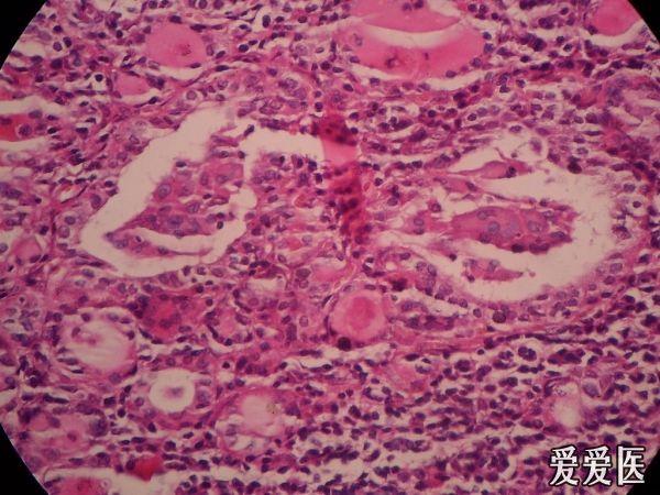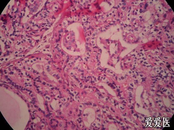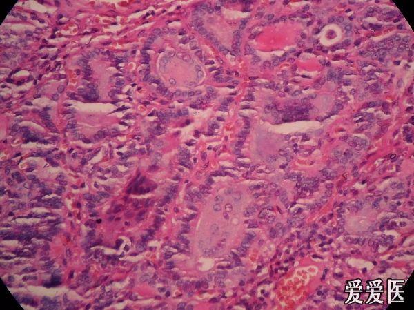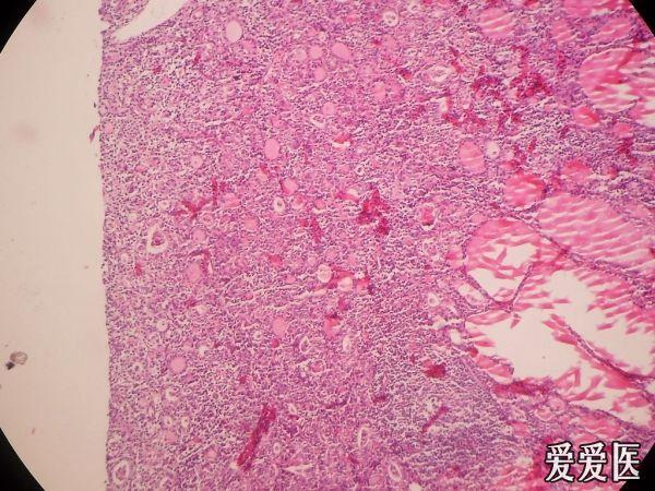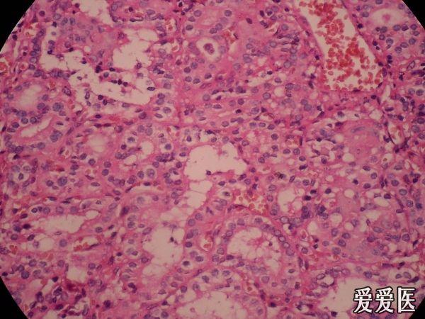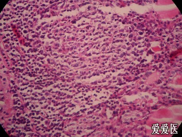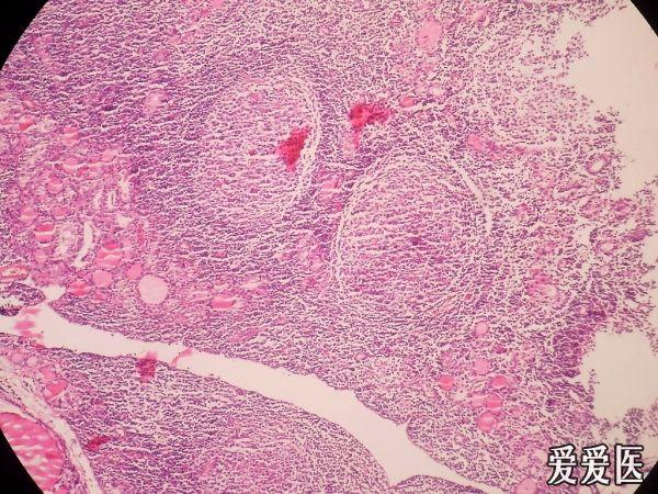 镜下: 淋巴滤泡:大小不规则的甲状腺滤泡:有的细胞核似有异型性?
