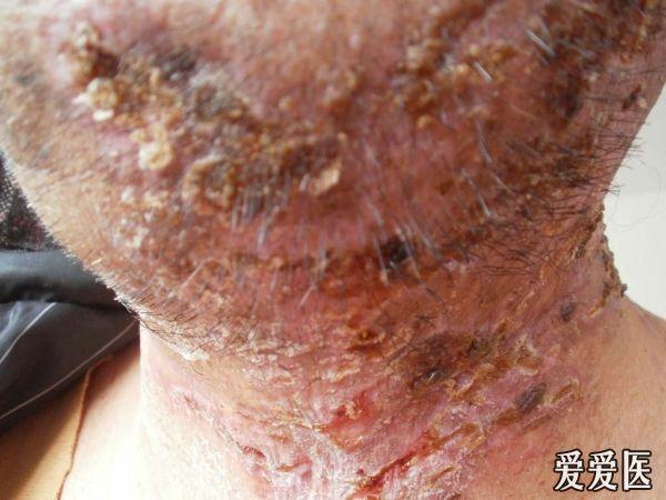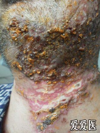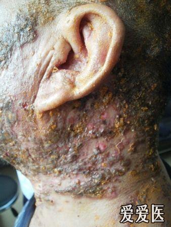 现病史:该患10天前无明显诱因发现左颈部出现丘疱疹,在当地诊所及用偏方治疗,未见明显好转并逐渐出现溢脓、溃疡,病程中自感觉疼痛,为进一步治疗而于今日就诊。
