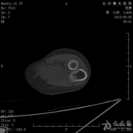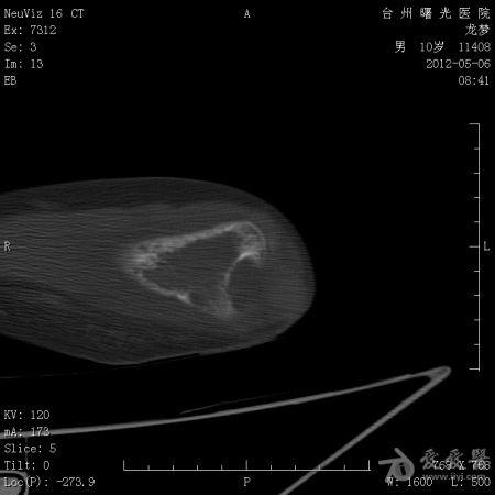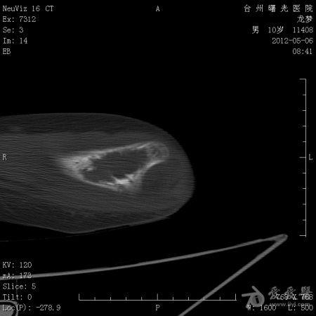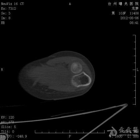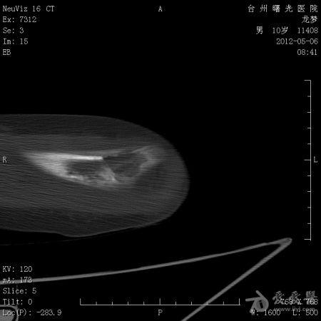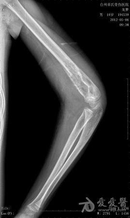 体格检查: 一般状况好,发育良好,营养中等。头颅五官胸腹未见异常。右肘部,右上臂下端肿胀,压痛、纵向叩击痛(+),局部肤温增高。肘关节固定于约40°,背伸约20°,肘屈约100°,表面无血管充盈,无色素沉着。右上肢皮肤感觉正常,右桡动脉搏动正常。