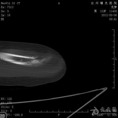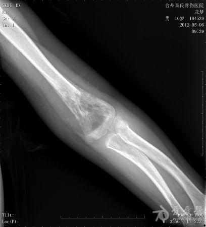 年龄:10岁主诉: 右上臂疼痛活动受限20余天现病史: 20余天前摔伤致右肘部疼痛活动不利,曾在外院治疗,X线:右肘部未见明显异常。肘关节活动尚可,于活血化瘀,消肿止痛治疗。20余天疼痛未见明显好转,肘关节活动不利,***就诊。既往史: 既往健康