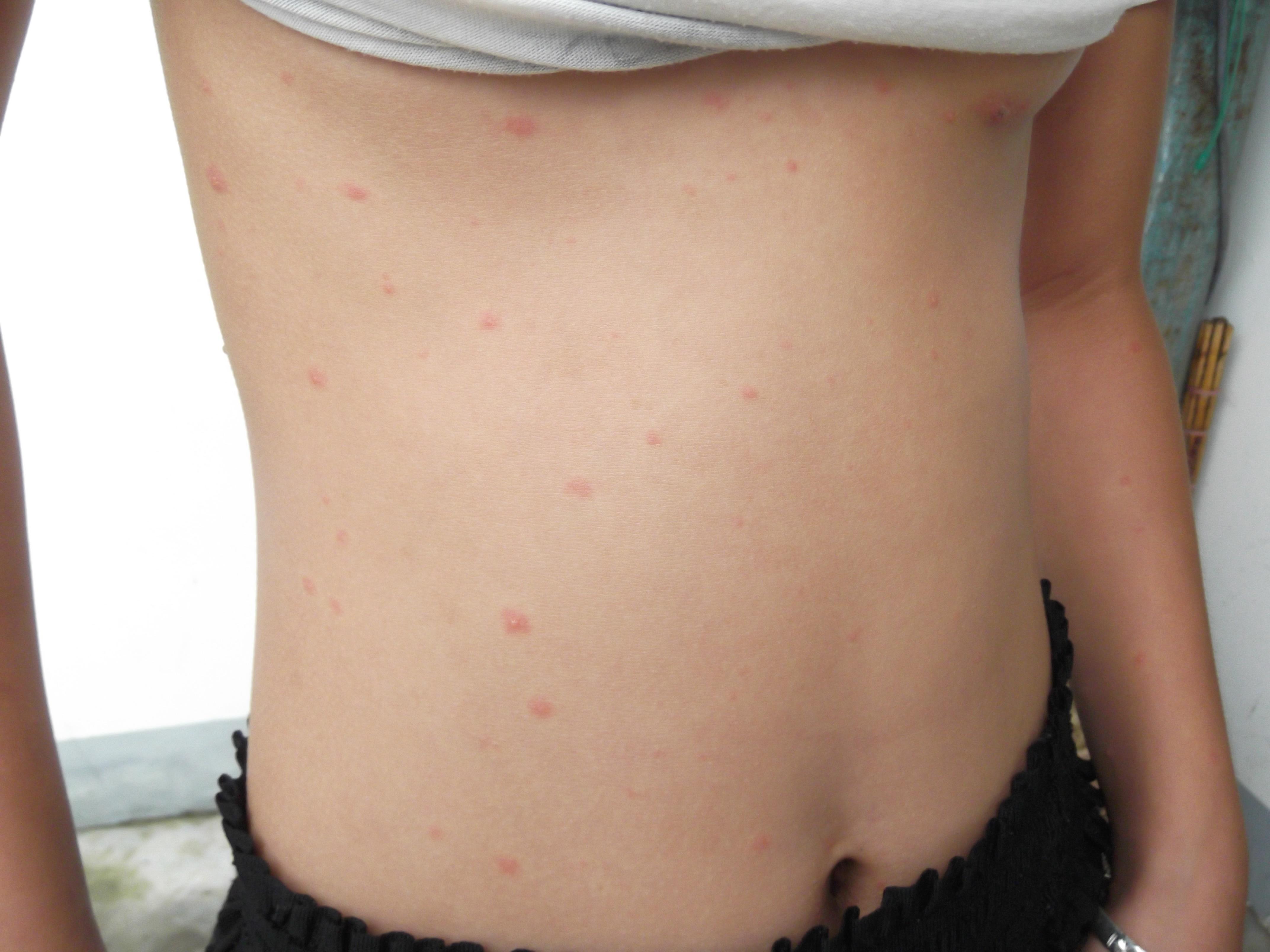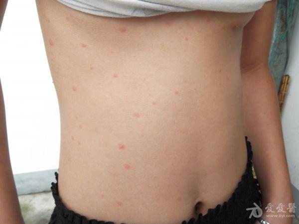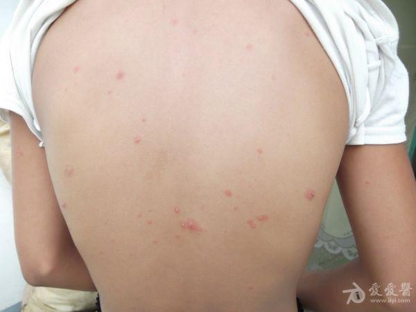 今天上午,碰到一水痘患儿,11岁,轻痒。昨天来诊时只见零星几天小红点,没敢肯定是水痘。今天全身及面部散布满小红点及水泡。