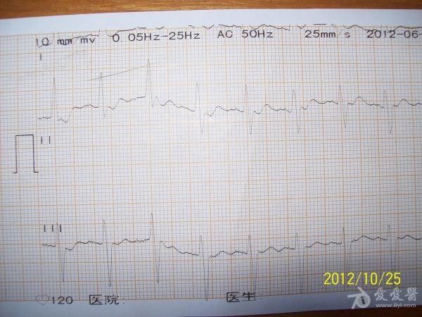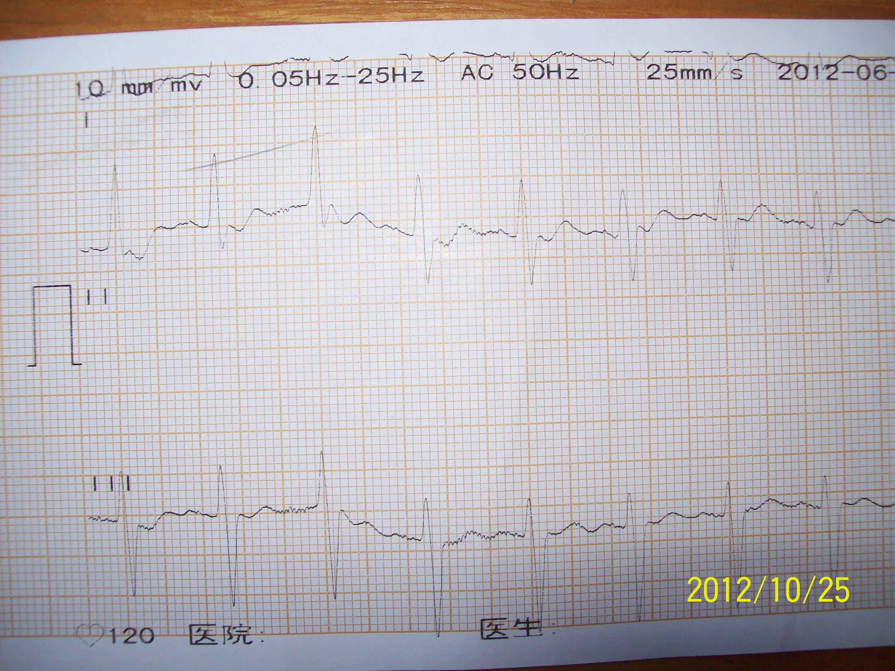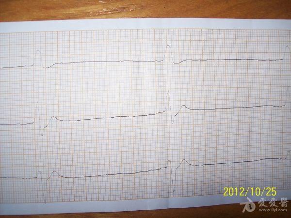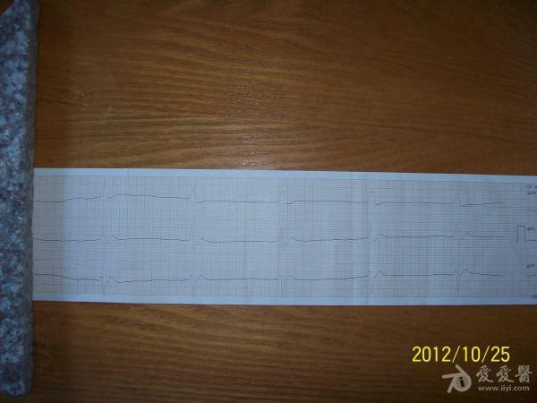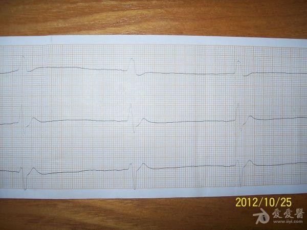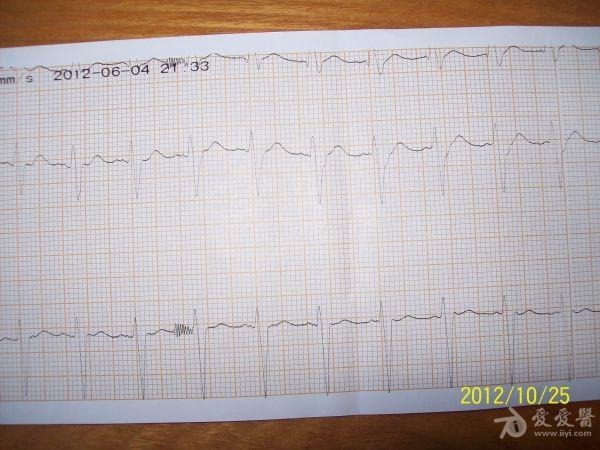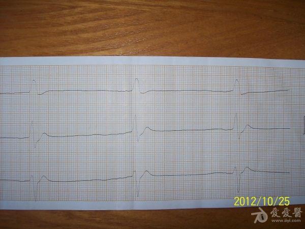 这是一个30来岁的男性,因服用降压药物导致头痛,呕吐1小时,后昏迷,来医院时的心电图