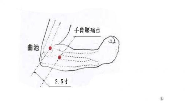 手臂腰痛点定位:手臂腰痛点位于曲池穴下2.5寸(如图示处)操作方法:**时曲肘横手,掌心向内,局部消毒,用28号3寸毫针,先垂直进针1.5~2寸深,行捻转平补平泻1分钟,再将针提至皮下,针尖稍向上刺入2~2.5深,施捻转平补平泻手法,根据病人的忍耐程度给予较强的**量。然后让病人做后退走动作3~5分钟,再让病人做各种姿势动作,若患部能出汗最好,大多一次一针可愈。【按】手臂腰痛点为经验穴,实践多次,疗效显著,可迅速缓解及去掉腰部疼痛及不适