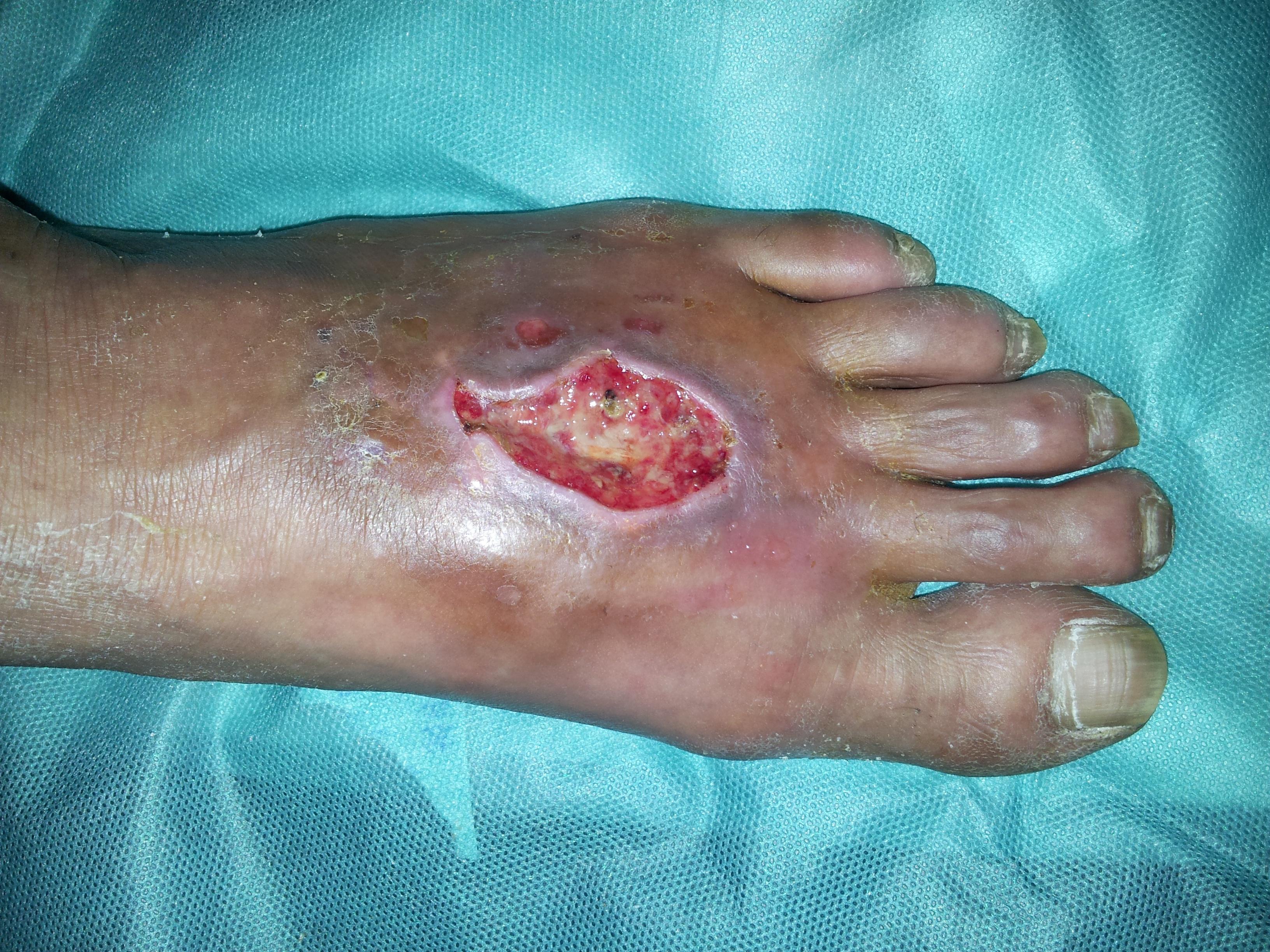 该患者足背砸伤后,皮肤坏死,伴肌腱外露。以下是该患者图片: