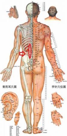 3,如图所示,左侧,俯卧位,从肝俞到骶髂处,滚法,或拨筋、或穴位点按;穴位以肝俞、脾俞、肾俞、三焦俞、大肠俞、胃仓、志室等。