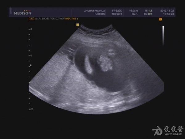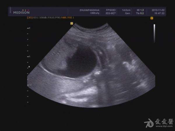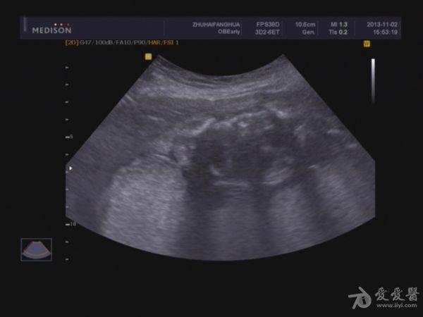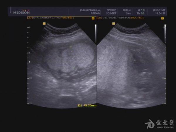 胎盘:附着于子宫后壁,厚度44mm,成熟度:0级,范围面积大,几乎覆着全后壁。