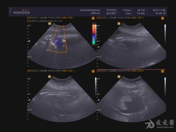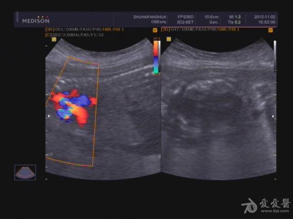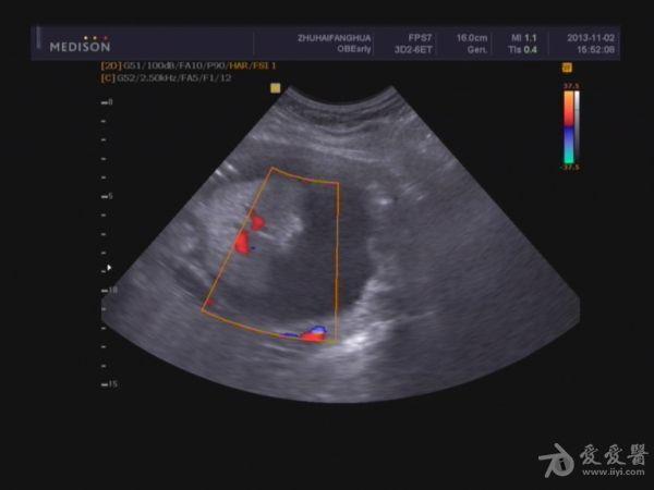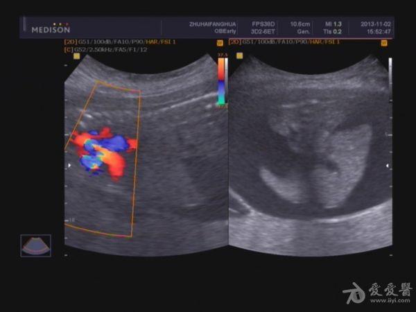 脐带:结构正常,脐动脉血流参数:SPV:33cm/s,PI:1.0,RI:0.62,S/D:2.6。典型图片如下: