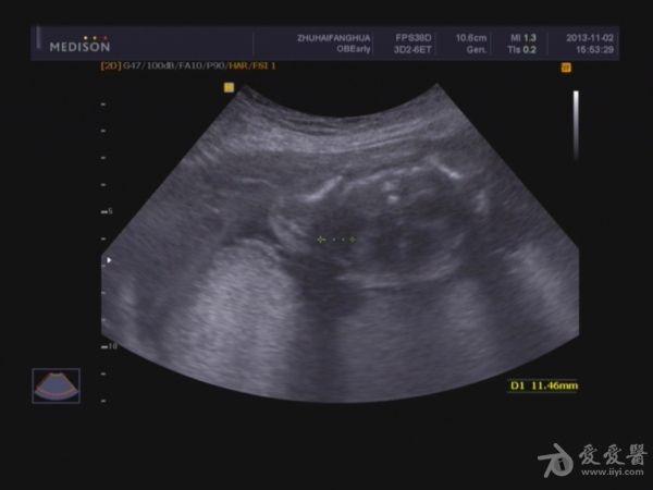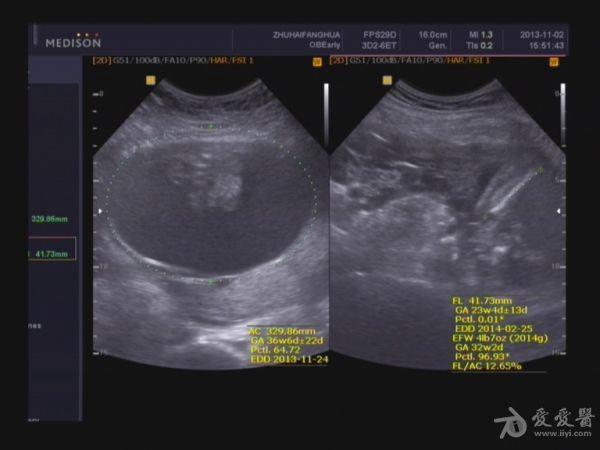 本帖最后由 jlslst 于 2013-11-2 21:06 编辑 女 25岁,中期孕胎儿产前超声筛查,超声所见:BPD:53mm(22w+1d), H C:212mm(23w+2d),A C:329mm, F L:38mm(23w+0d),HUM:不清,AFD:14mm,AFI:38mm,