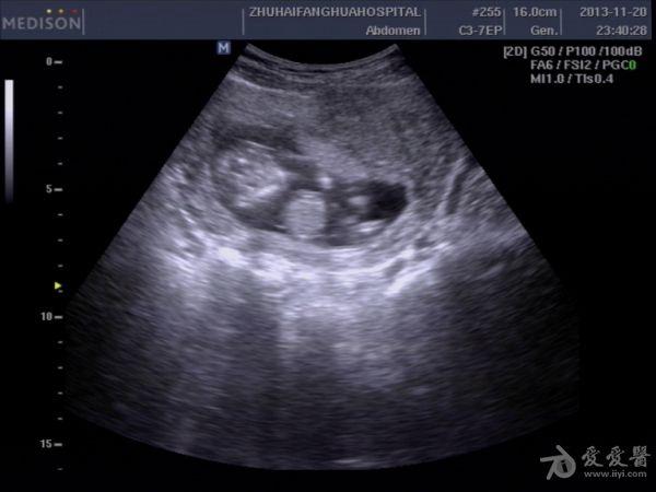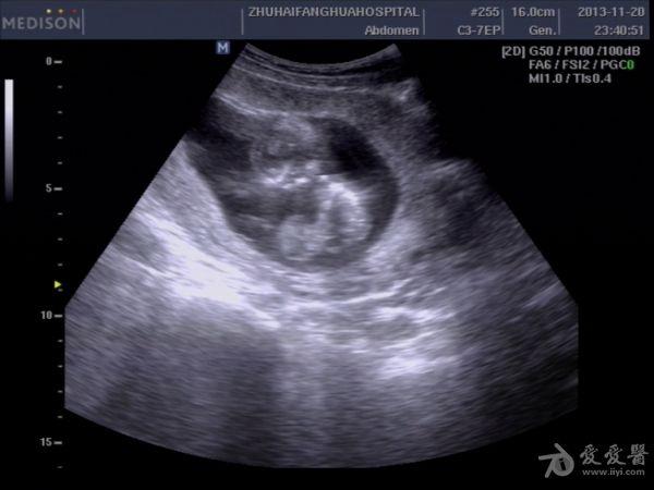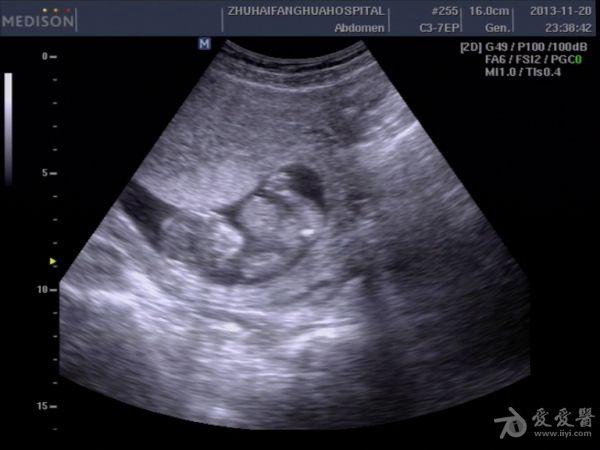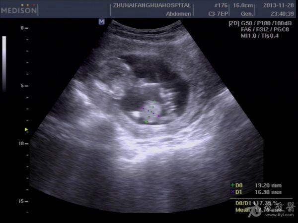 13周孕,24岁,初孕 因腹痛急诊***检查,是当天早上3点钟,医生提的黑白超,学生胆挺大的,超声图像如下: