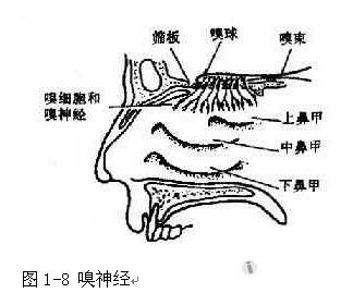 3.顶壁:呈狭小的拱形,前部为额骨鼻突及鼻骨构成。中部是分隔颅前窝与鼻腔的筛骨水平板(cribriform plate),此板薄而脆,并有多数细孔,呈筛状,嗅神经经此穿过进入颅前窝。外伤或手术时易骨折致脑脊液鼻漏,成为感染入颅的途径。4.底壁:即硬腭,与口腔相隔,前3/4由上颌骨腭突,后1/4由腭骨水平部构成,两侧部于中线相接,形成上颌骨鼻嵴,与犁骨下缘相接,底壁前方近鼻中隔处,两机时各有一切牙管开口,腭大动、静脉及腭前神经由此通过。(三)鼻腔粘膜按其组织学构造和生理机能的不同,分为嗅区粘膜和呼吸区粘膜两部分。1.嗅区粘膜:分布于上鼻甲及部分中鼻甲内侧面及相对应的鼻中隔部分,为假复层无纤毛柱状上皮,由嗅细胞、支持细胞、基底细胞组成。其固有层内含分泌浆液的嗅腺,以溶解有气味物质微粒,产生嗅觉。嗅细胞为双极神经细胞,其中央轴突汇集多数嗅细胞嗅丝,穿过筛板达嗅球,周围轴突突出上皮表面,成为细长的嗅毛(图1-8)。