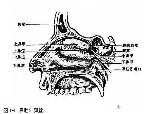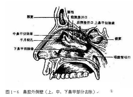 (1)上鼻甲(superior turbinate):位于鼻腔外壁的后上部,位置最高、最小,因前下方有中鼻甲遮挡,前鼻镜检查不易窥见。上鼻甲后上方为蝶筛隐窝(sphenoethmoid recess),蝶窦开口于此。(2)上鼻道(superior meatus):内有后组筛窦开口。(3)中鼻甲(middle turbinate):系筛骨的突出部,中鼻甲中常有筛窦气房生长,使鼻腔上部显著缩窄。中鼻甲前端外上方的鼻腔侧壁有小丘状隆起称为鼻丘,是三叉神经、嗅神经所形成的丰富的反射区。(4)中鼻道(middle meatus):外壁上有两个隆起,后上方为筛窦的大气房名筛泡(ethmoid bulla ),筛泡前下方有一弧形嵴状隆起名钩突(uncinate process),筛泡钩突之间有一半月形裂隙,称为半月裂孔(semilunar hiatus),其外方有一弧形沟称筛漏斗(ethmoid infundibulum),额窦多开口于半月裂孔的前上部,其后为前组筛窦开口,最后为上颌窦开口。(5)下鼻甲(inferior turbinate):为一***骨片,附着于上颌骨内壁,前端距前鼻孔约2cm后端距咽鼓管口约1cm,为鼻甲中最大者,约与鼻底同长,故下鼻甲肿大时易致鼻塞或影响鼓管的通气引流。(6)下鼻道(imferior meatus):前上方有鼻泪管开口,其外段近下鼻甲附着处骨壁较薄,是上颌窦穿刺的最佳进针部位(图1-7)。