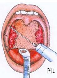 1.1%普鲁卡因或1%利多卡因20ml中加入4~5滴1∶1000肾上腺素。分别注入舌腭弓上、中、下三点(图1)。粘膜下浸润,针尖沿扁桃体窝刺入,不超过1cm回抽无血后麻药注入扁桃体包膜外。上、中、下点各注3~5ml。