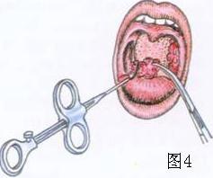 4.调整好的扁桃体圈套器先套入扁桃体钳上,再将此钳住扁桃体,沿扁桃体钳将钢丝圈下滑套住扁桃体下极。将圈套器尖部向外,下推,扁桃休钳向内牵拉扁桃体快速收紧钢丝圈,绞断蒂部(图4)。