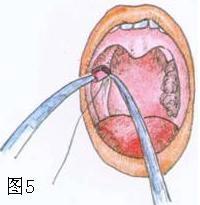 5.切除扁桃体后立即用血管钳夹持消毒棉球压迫扁桃体窝2~3分钟止血。用扁桃体拉