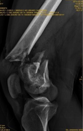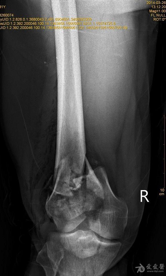 患者XXX,男,31岁,农民。高空跌伤致右大腿畸形伴活动性出血1小时入院。患者一般情况可,体重80kg。完善相关辅检,入院诊断:1.右股骨远端开放性粉碎性骨折;2.右髌骨粉碎性骨折;3.右桡骨远端骨折。入院后行右股骨开放性骨折清创缝合术+右胫骨结节骨牵引术,布朗支架抬高制动,目前患者右大腿远端肿胀明显,给予抗感染,消肿止痛等对症支持治疗。 2014-3-19,爱爱医***里mimi98发了类似的帖子,我刚好也遇到了同样的病例,诚心向各位老师、战友寻求好的治疗方案。