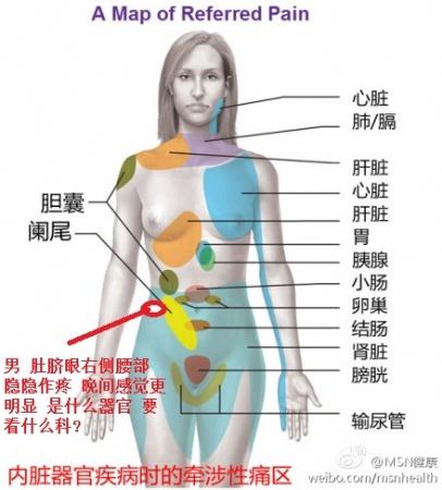 可能与肾脏、肠道、胆囊等脏器有关,须看外科。